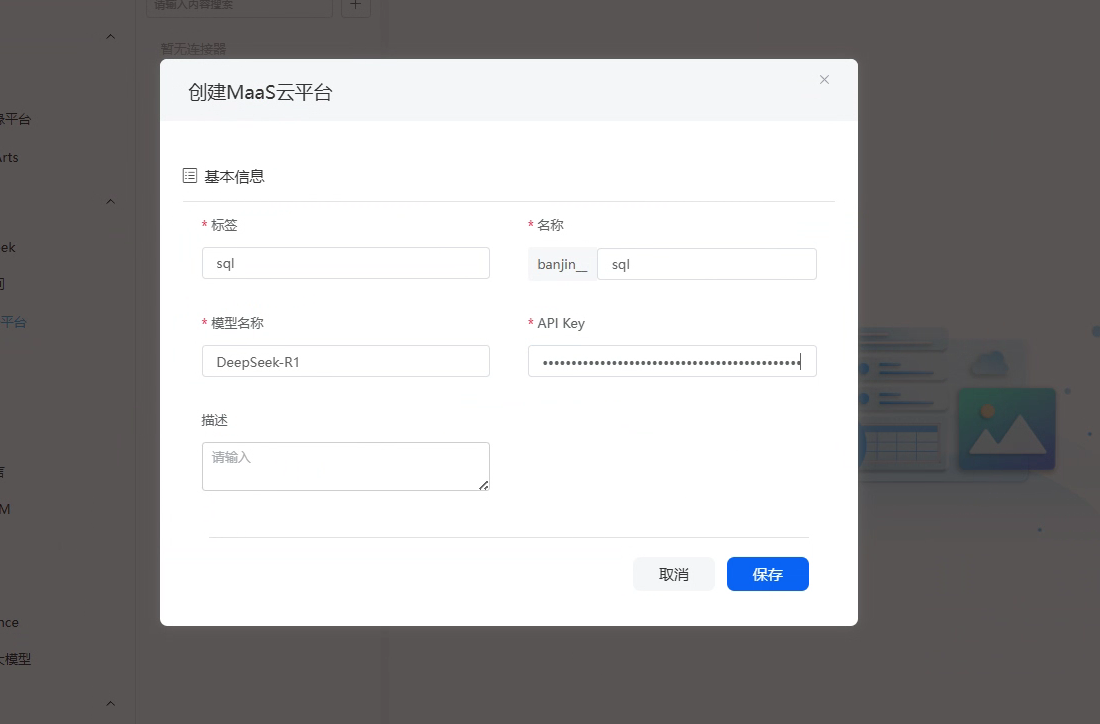 点击右上角加号,创建自定义连接器,输入标“标签”(这里为sql,可自定义)、“名称”(这里填入MaaS,可自定义)、“模型名称”(前步保存的模型名称)和“APIKey”(前步保存的apiKey);点击保存: