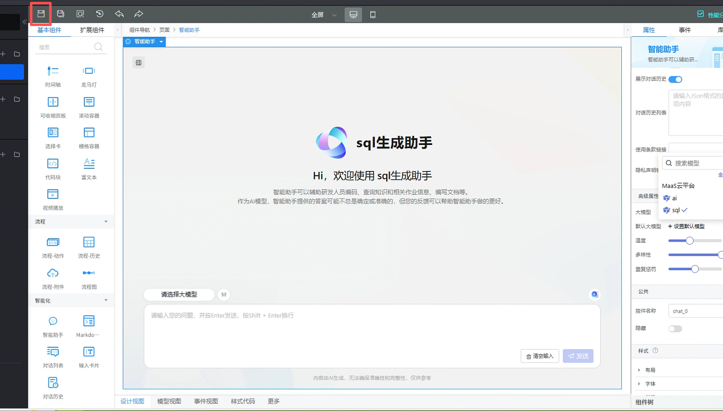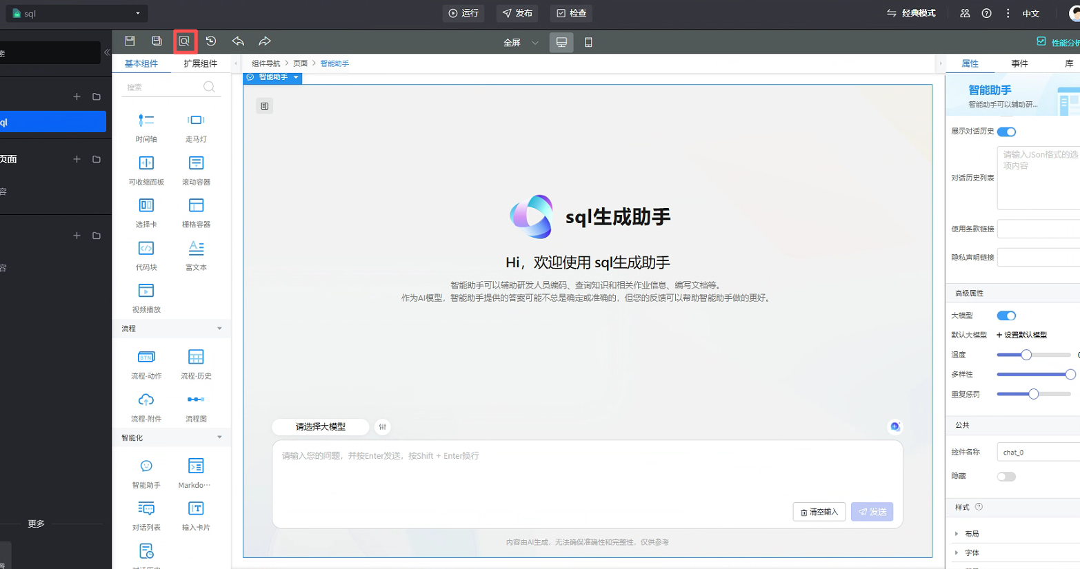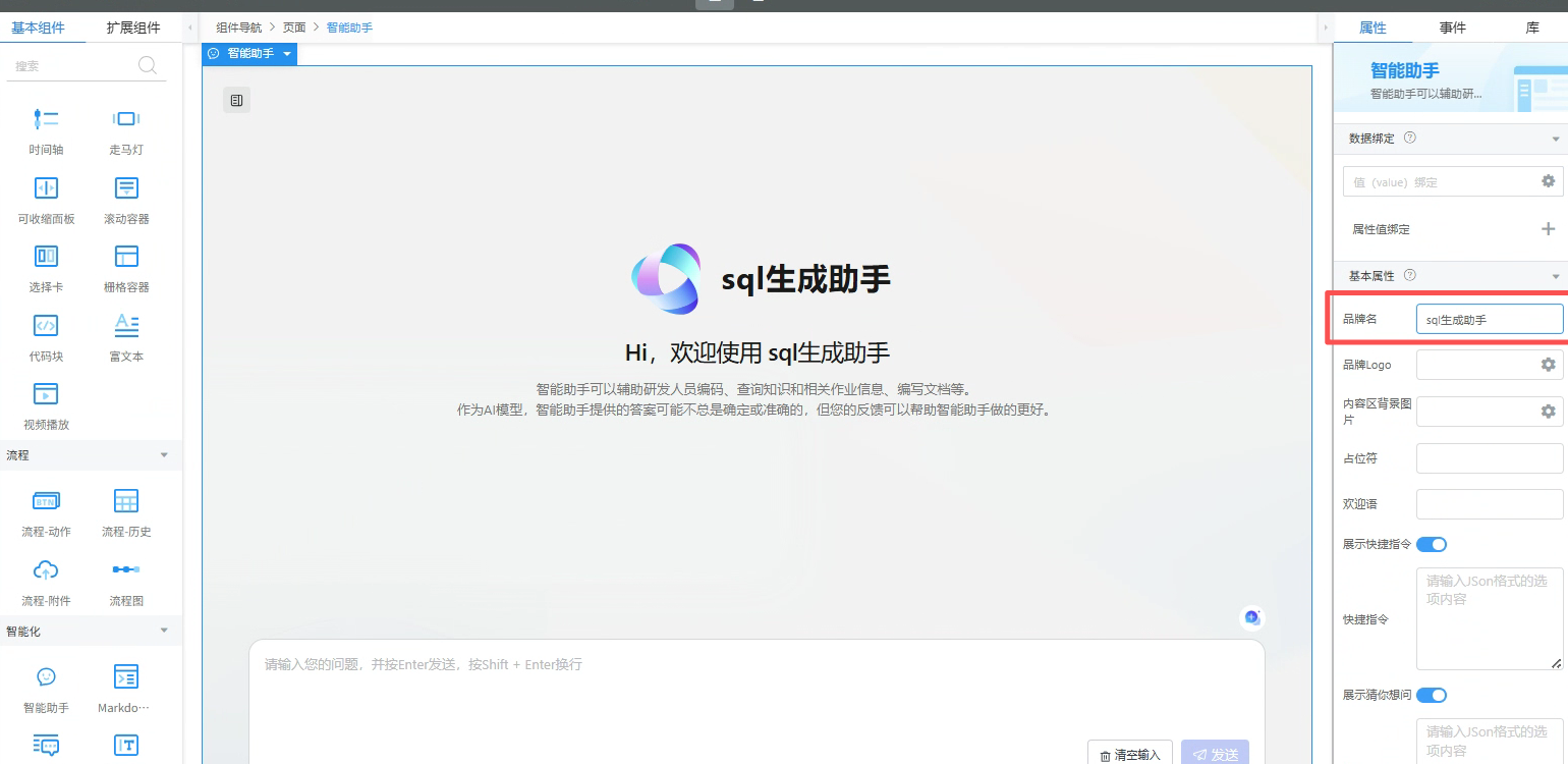 选中智能助手组件,在“属性 > 品牌名”中,输入“sql生成助手”