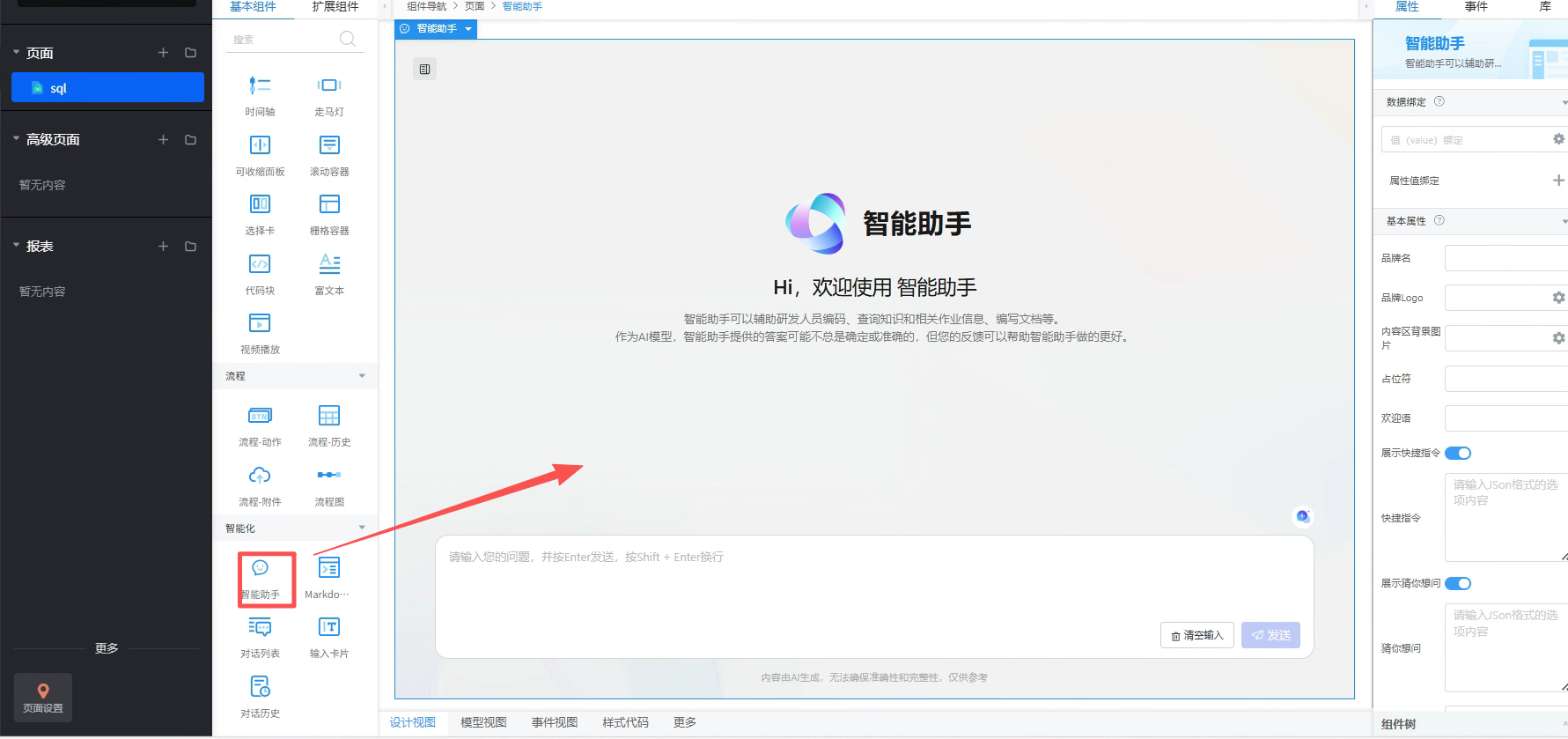 添加表单:从左侧“组件”区域,将智能化智能助手”组件拖拽到页面中间