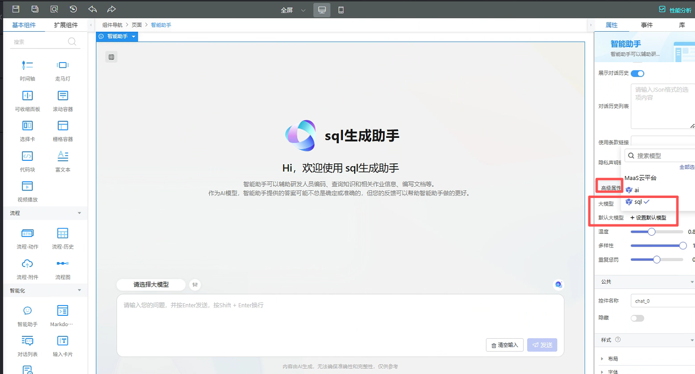选中智能助手组件,在“属性 > 高级属性”中,打开“大模型”开关。在“默认大模型”中,单击“设置默认模型”,选择上面步骤中创建的大模型连接器