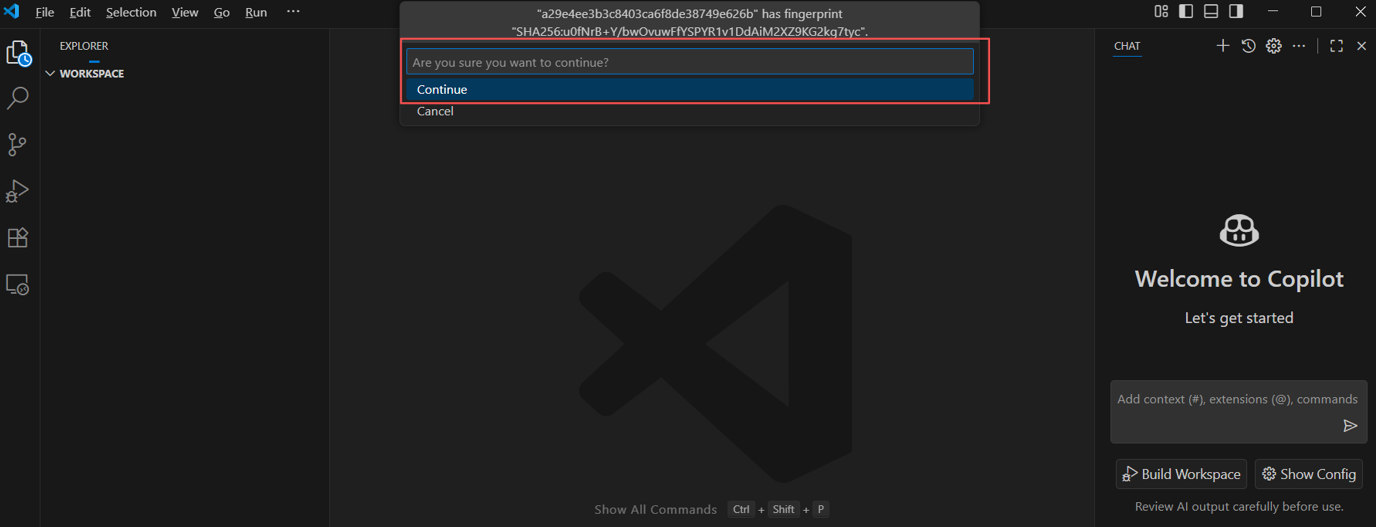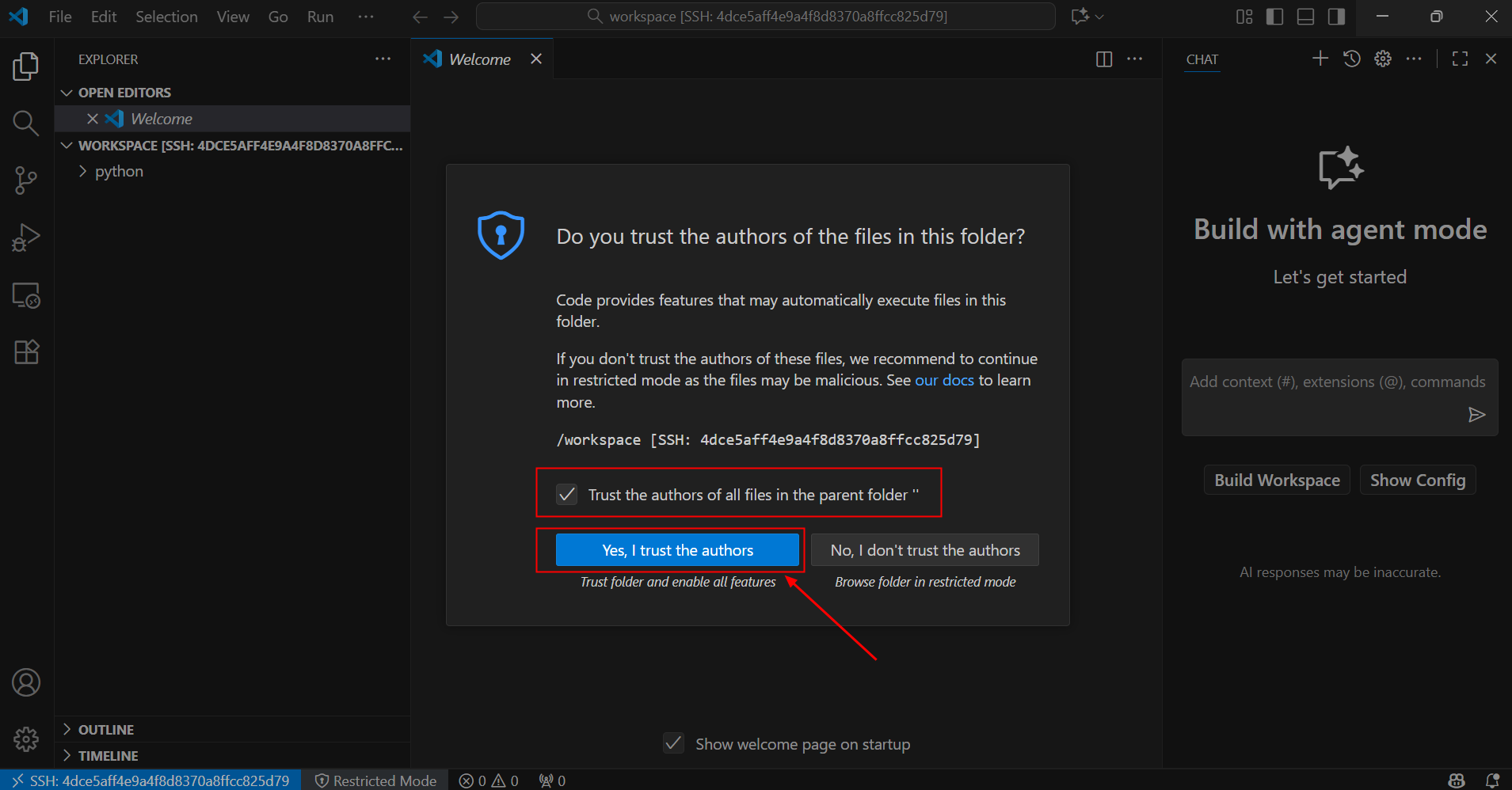 VS Code Server下载完成之后,弹出弹窗,我们勾选Trust the authors of all files in the parent folder,然后点击:Yes,I trust the authors。