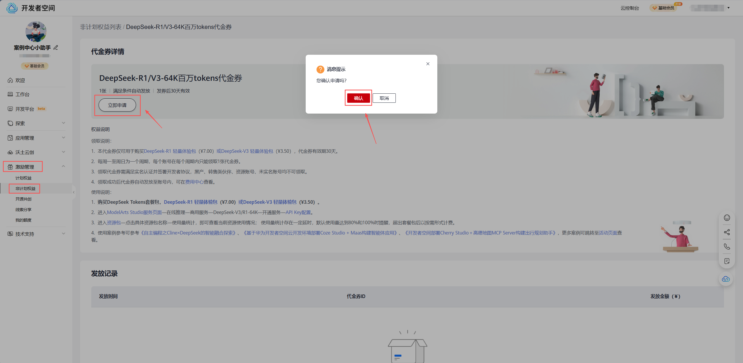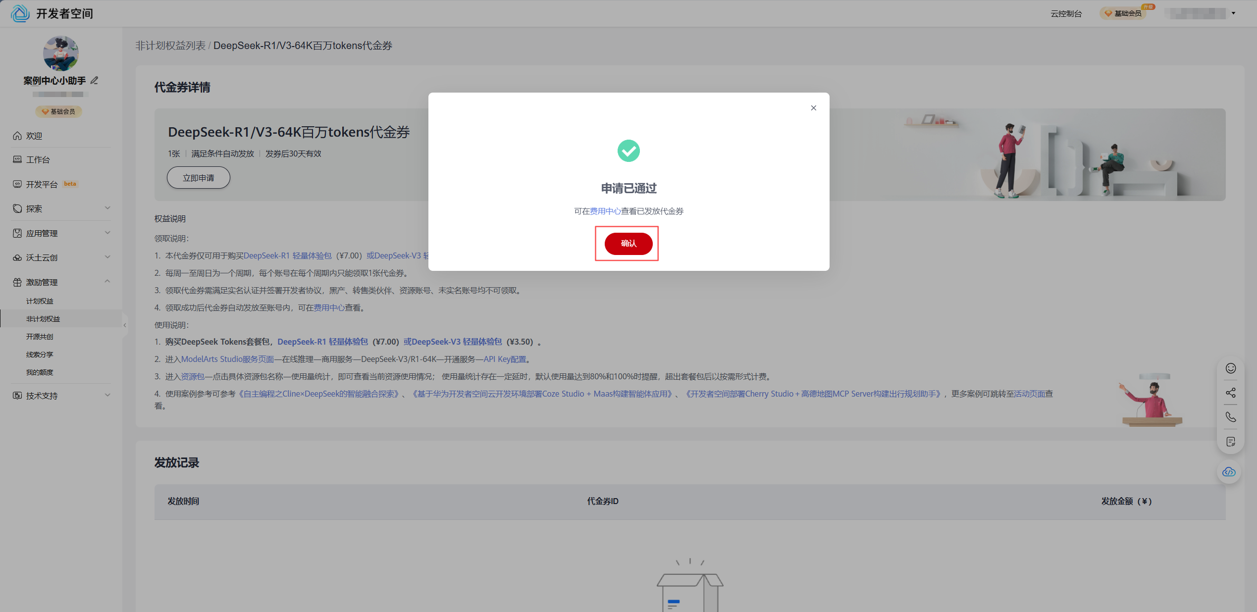 4.1 登录华为开发者空间,领取百万token代金券福利