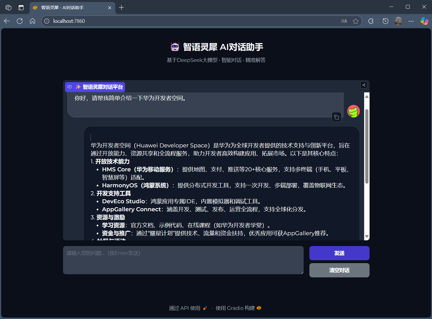 输入测试问题:“你好,请帮我简单介绍一下华为开发者空间”,智语灵犀 - AI对话助手正确回答。