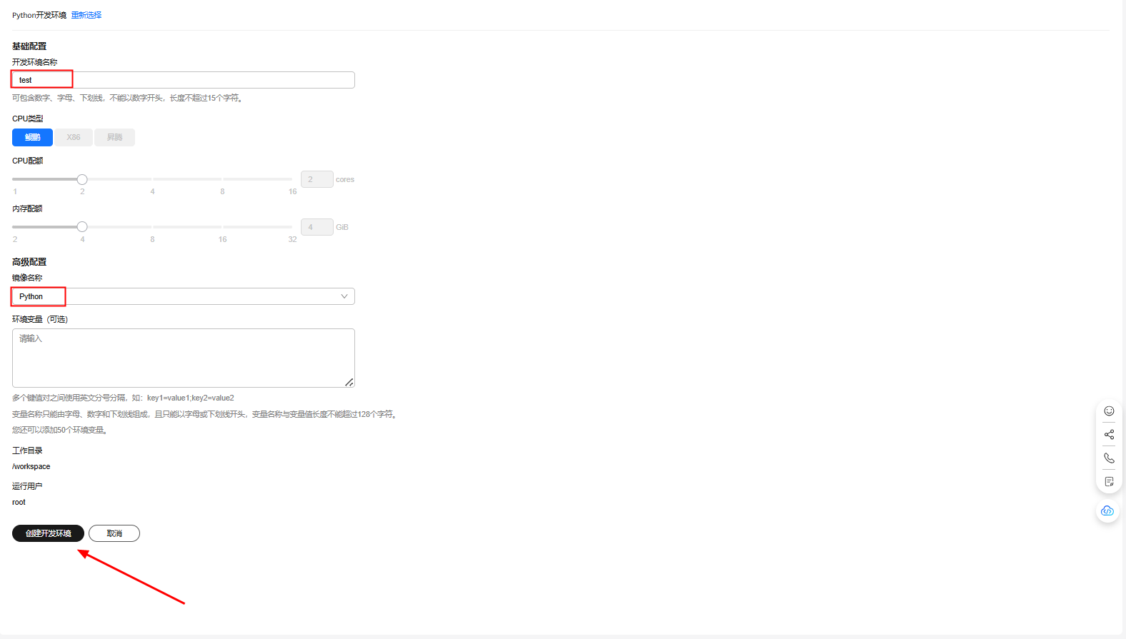 在云开发环境(容器)配置页面,基础配置板块,填写开发环境名称:test。高级配置板块,镜像名称选择Python。