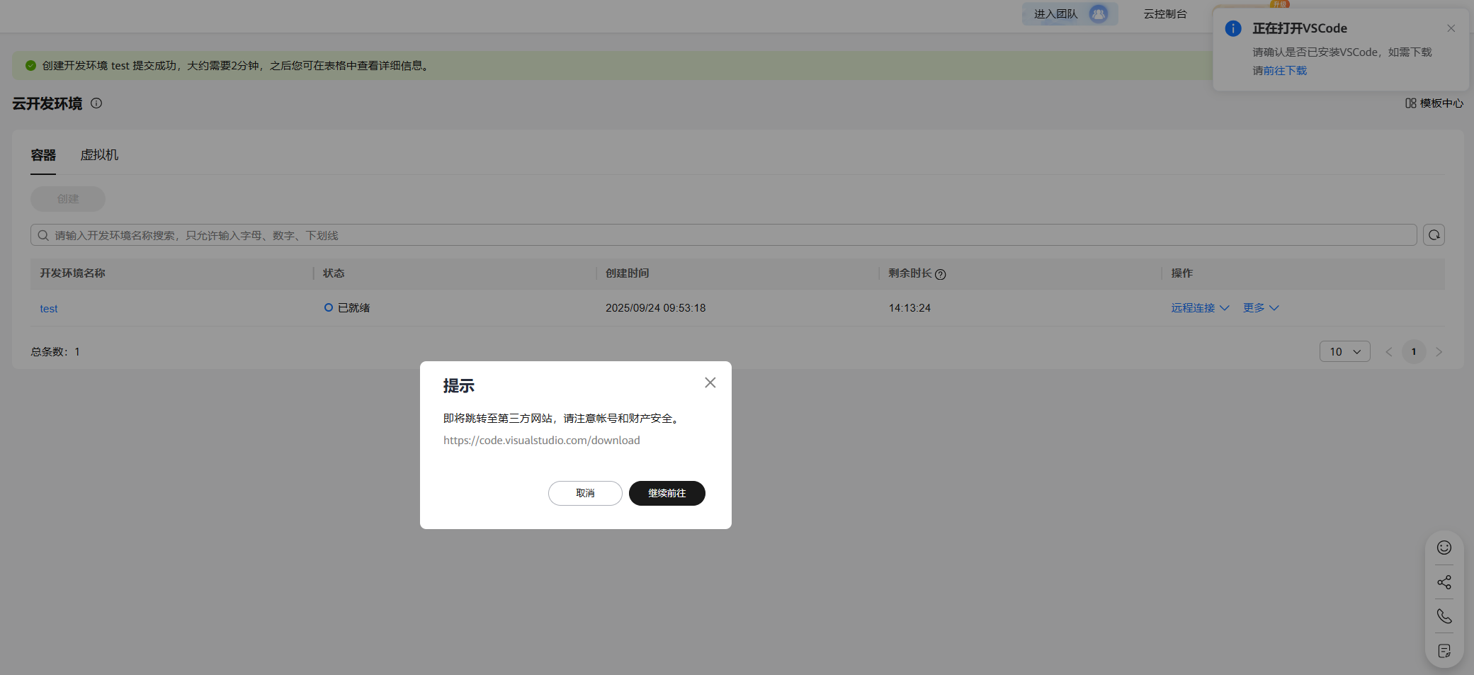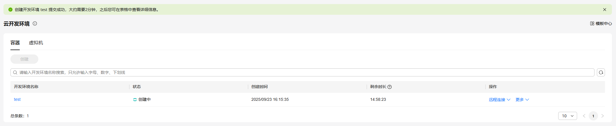 配置完成后,点下方的创建开发环境按钮,创建云开发环境(容器)test提交成功,状态为创建中,云开发环境(容器)创建大约需要2分钟。