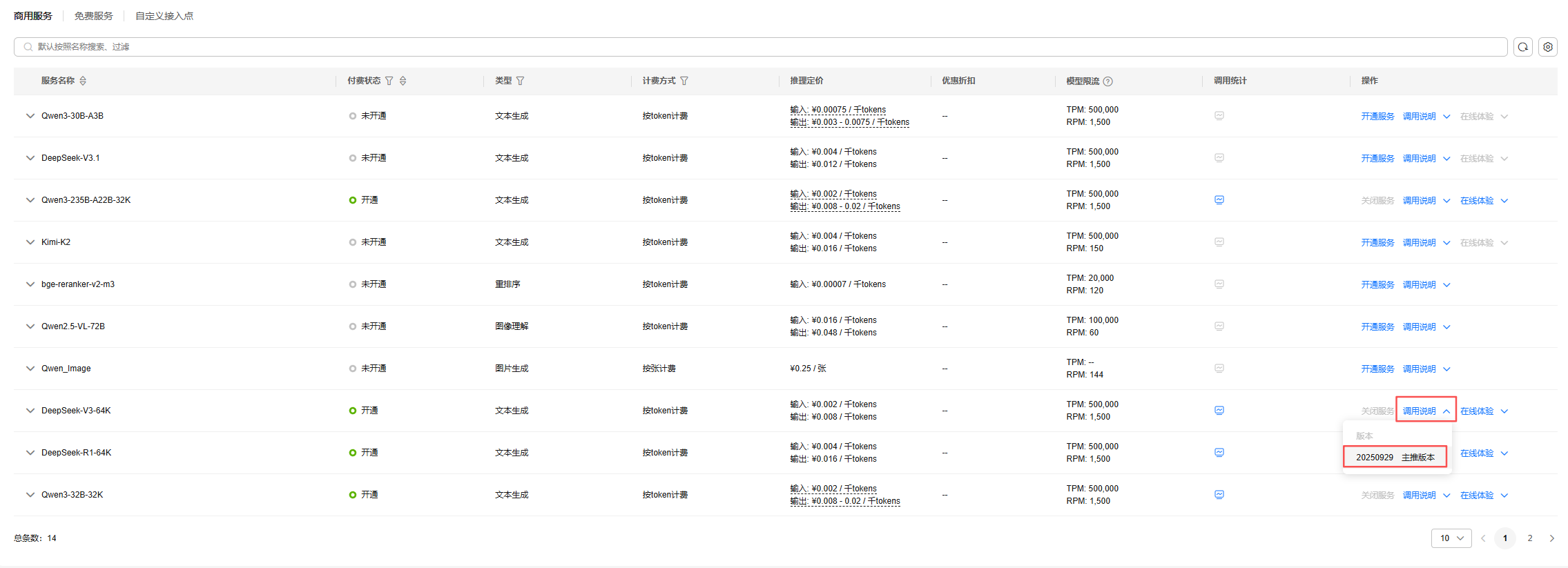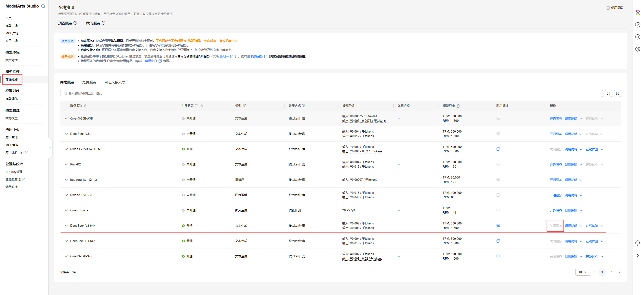 进入MaaS控制台页面 ,左侧导航栏点模型推理 → 在线推理,右侧预置服务 → 商用服务页签,在下侧的商用服务列表中找到DeepSeek-V3-64K,操作栏点开通服务。