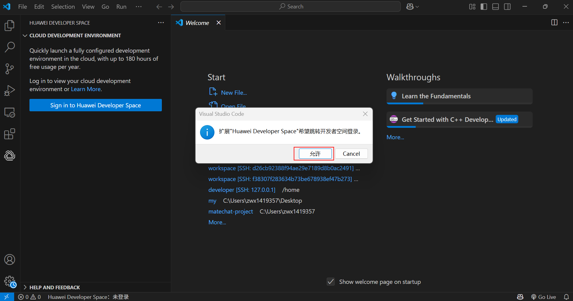 插件安装完成后,会自动打开并提示跳转开发者空间登录,选择允许。