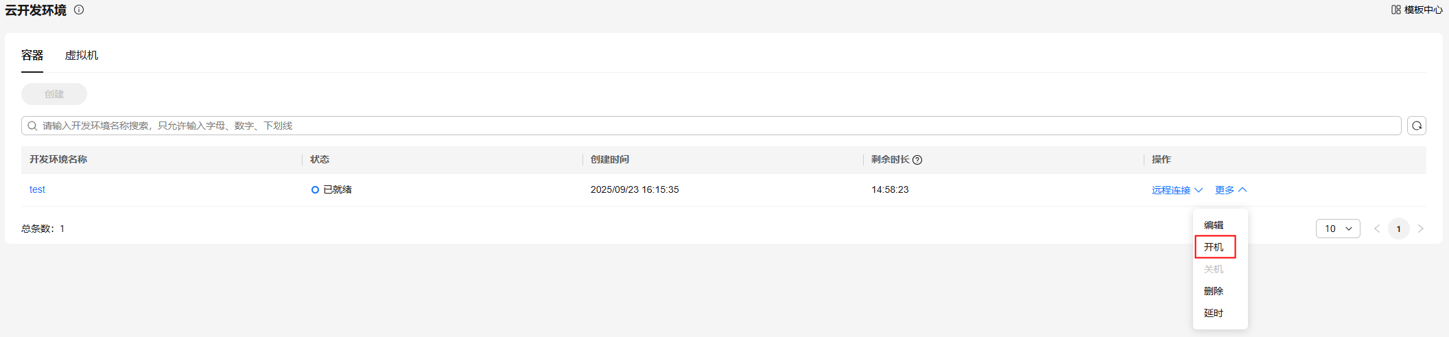 执行开机操作后,云开发环境(容器)test状态由已就绪变为开机中。