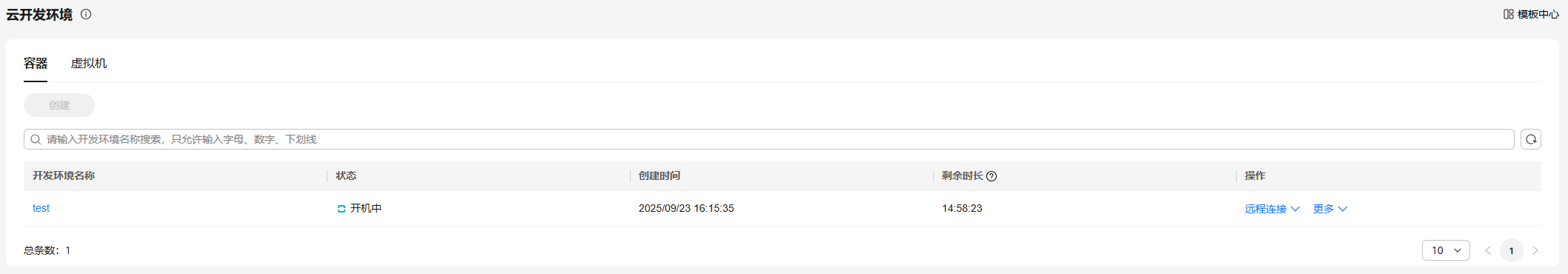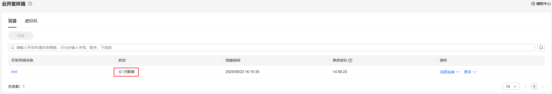 云开发环境(容器)创建完成后,可以在容器页签的开发环境列表中查看详细信息,其状态变更为已就绪。