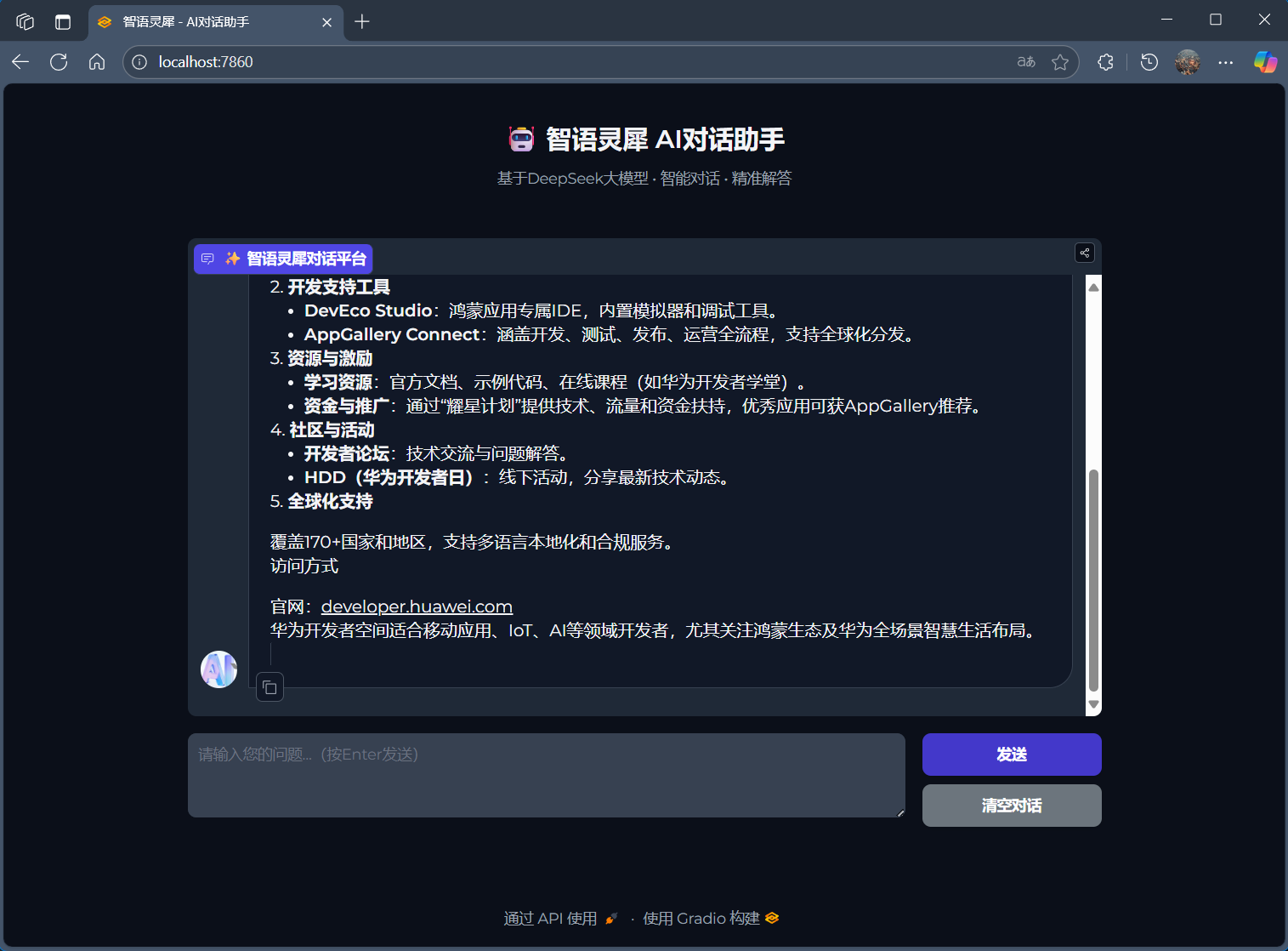 AI智能对话助手技术架构上,项目采用Python+Gradio技术栈,基于华为MaaS平台的强大算力支持,实现了高性能的智能对话服务。