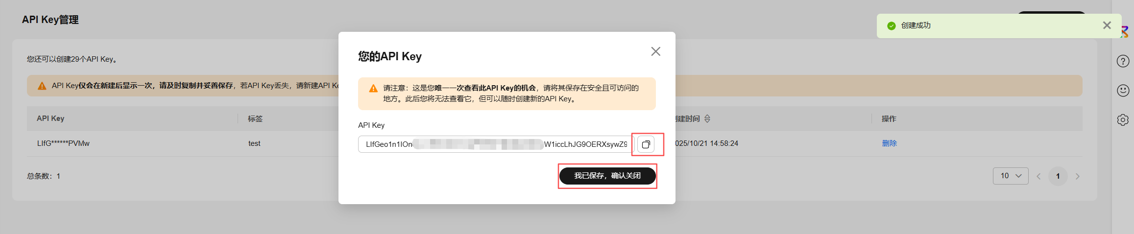 注:这是唯一一次查看此API Key的机会,请将其保存在安全且可访问的地方。此后将无法查看它,但可以随时创建新的API Key。