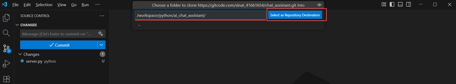 选择代码仓目录:/workspace/python/ai_chat_assistant/,点Select as Repository Destination。