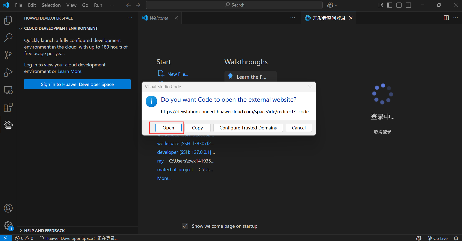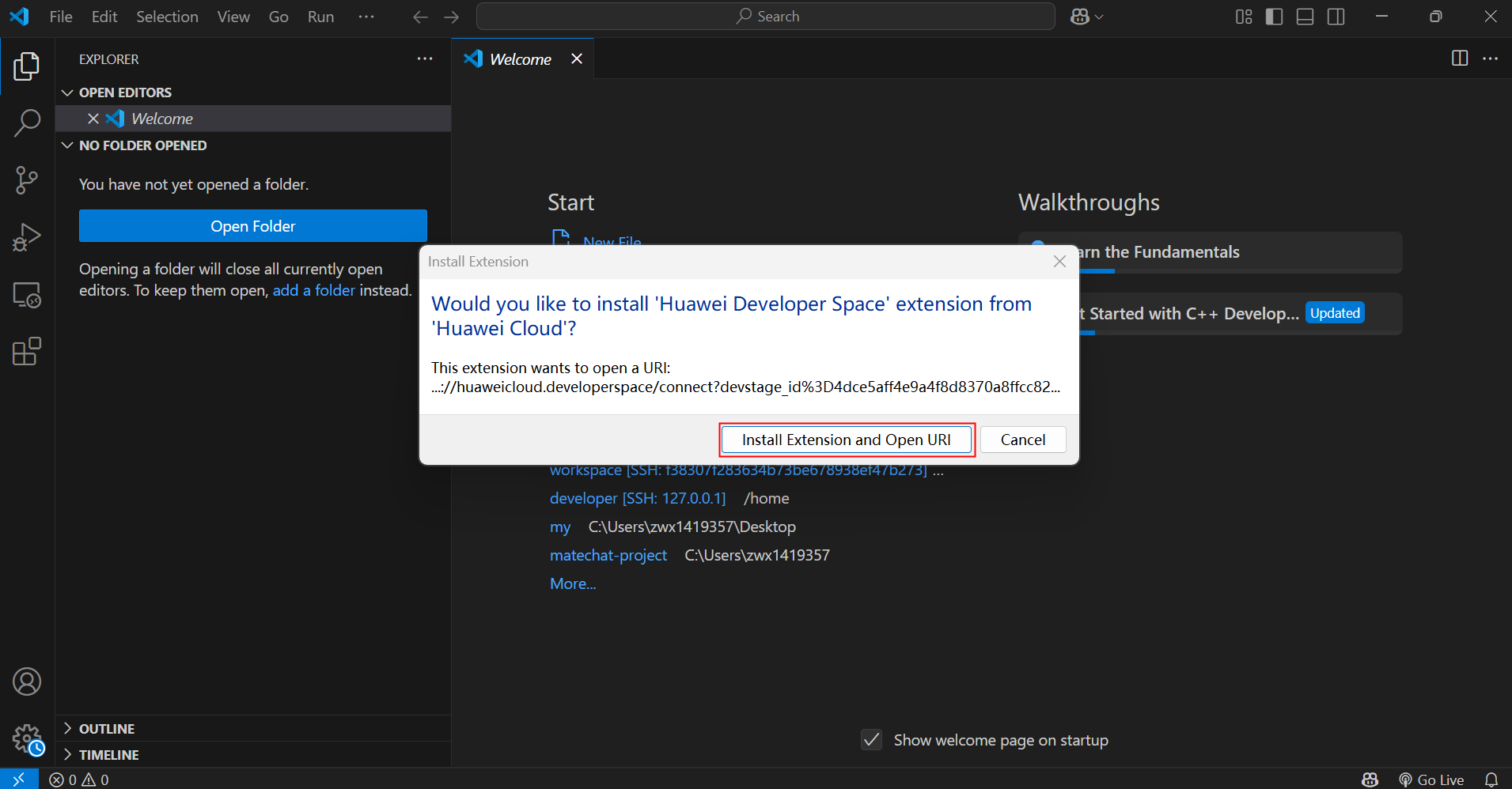 打开VS Code后,提示安装Huawei Developer Space,点Install Extension and Open URI。