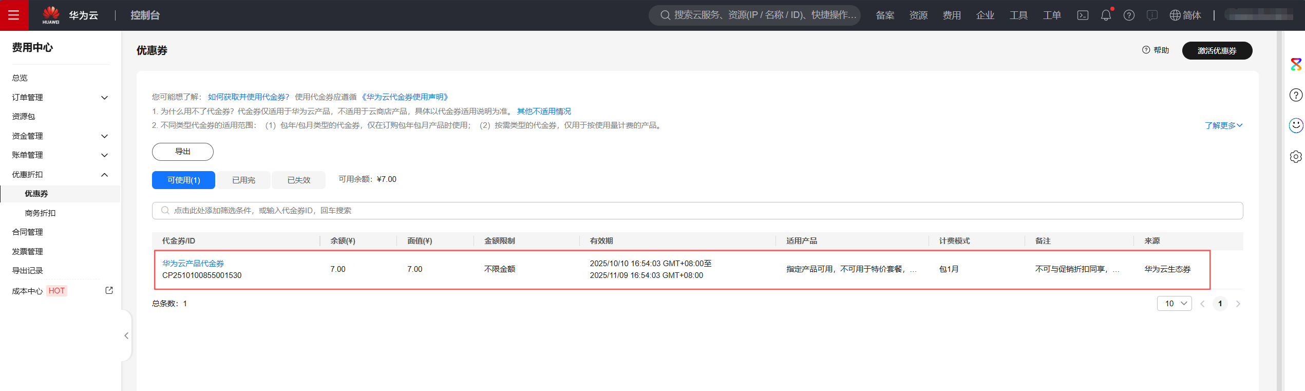 领取成功后可在费用中心优惠券 中查看。