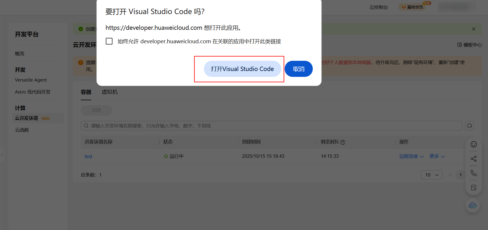 华为开发者空间 - 云开发环境(容器)支持VS Code等IDE远程连接。在云开发环境(容器)“test”操作栏点远程连接 > VS Code。