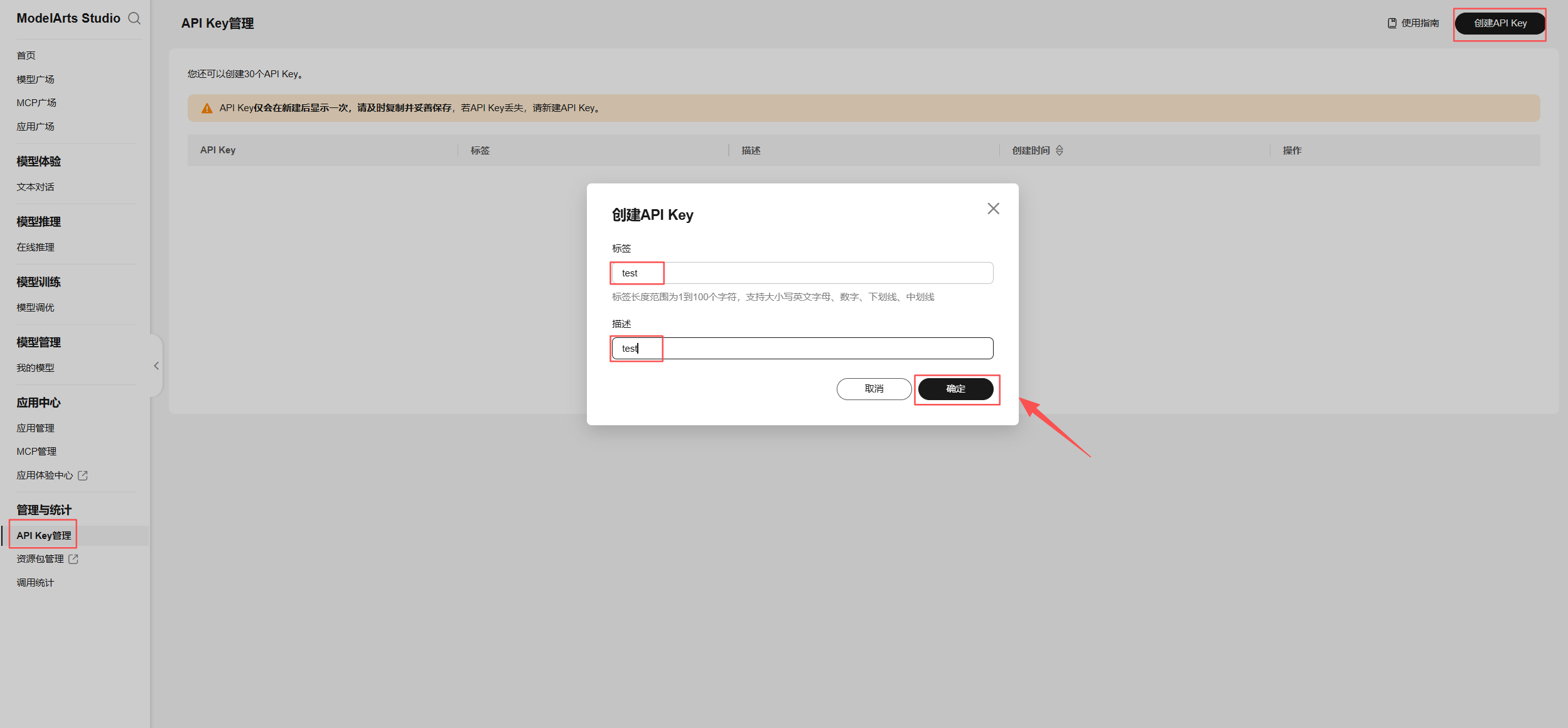 在API Key管理页,点右上角创建API Key。在弹出的配置弹窗中,标签和描述可以自定义,输入完毕后点击确定。
