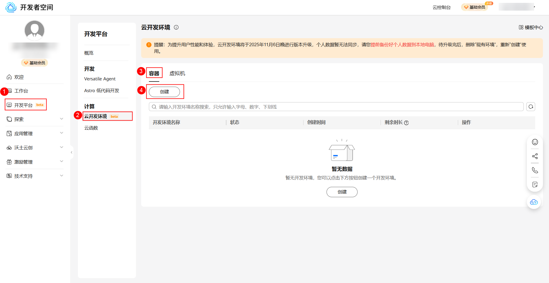 登录华为开发者空间 - 云开发环境 平台,右侧页签选择容器,点击创建。