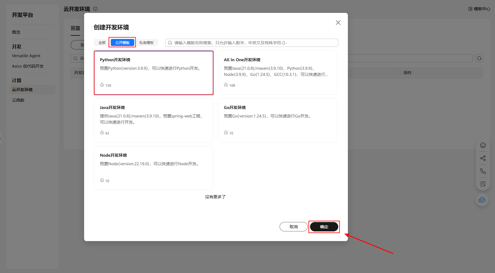 以公开模板中的Python开发环境为例,这里对其进行选中,点右下角的确定。