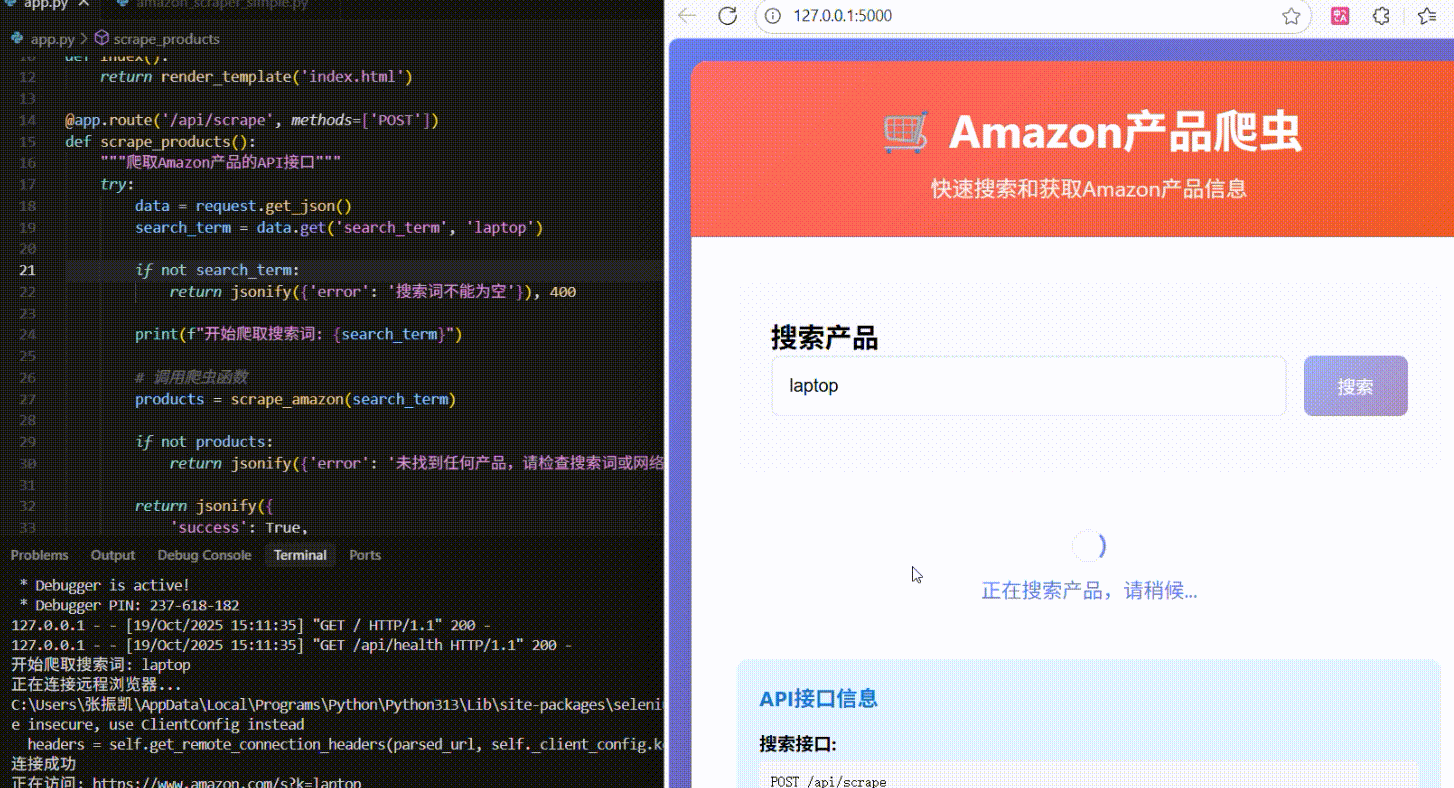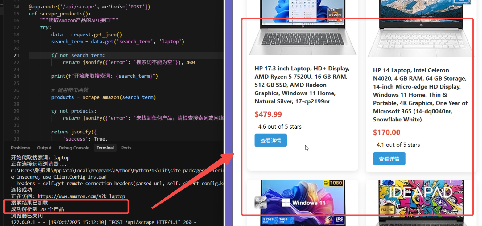 这时,后端 Flask 应用会接收请求,调用 amazon_scraper.py 中的函数,该函数会通过IPIDEA 代理启动一个无头 Chrome 浏览器,访问亚马逊并采集数据,最终将结果返回给前端进行展示。