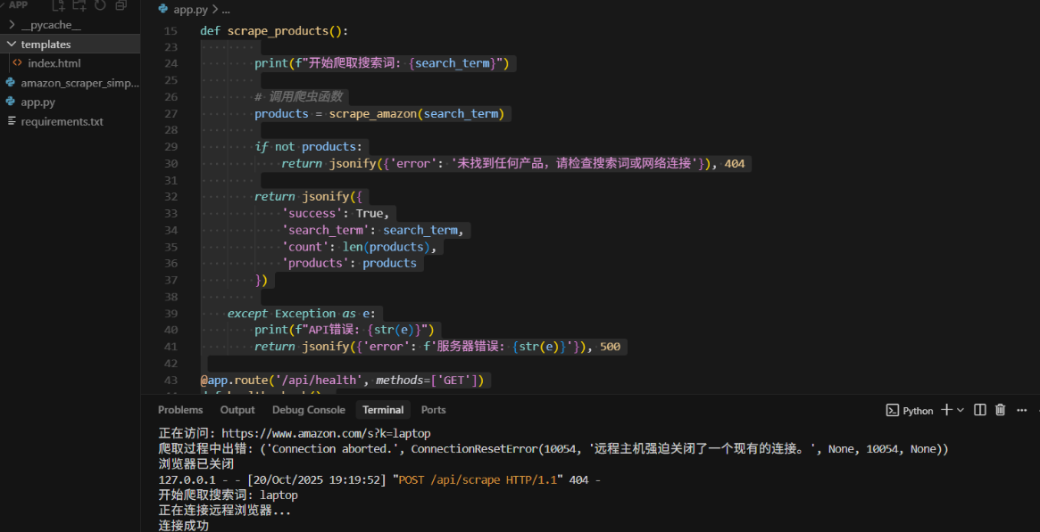 我们需要将 from amazon_scraper_simple import scrape_amazon 替换为 from amazon_scraper import scrape_amazon_search_results,并在 API 接口中调用新的函数。
