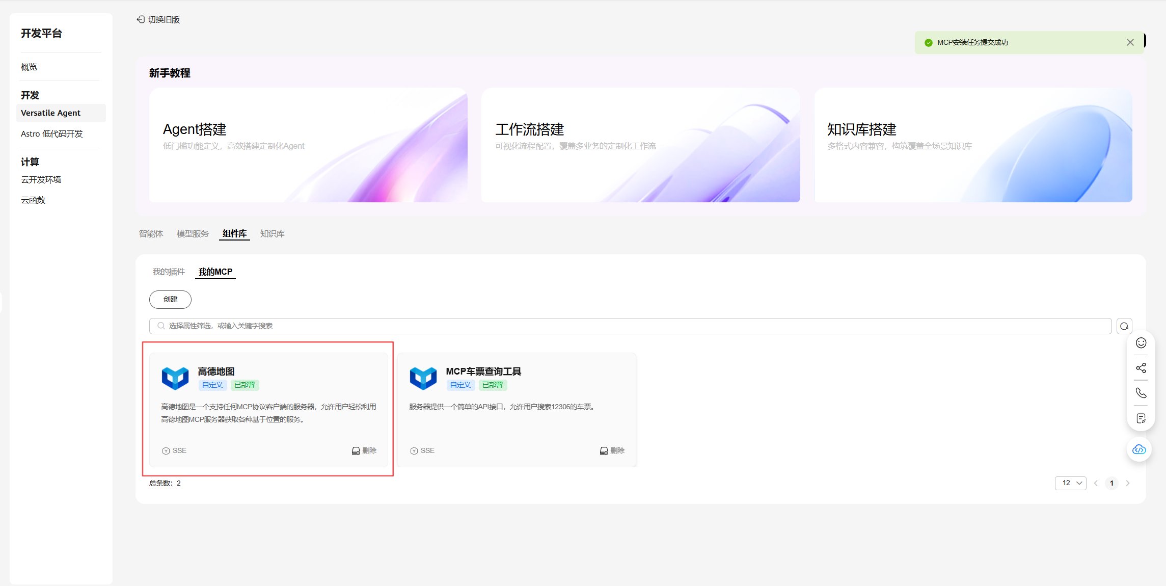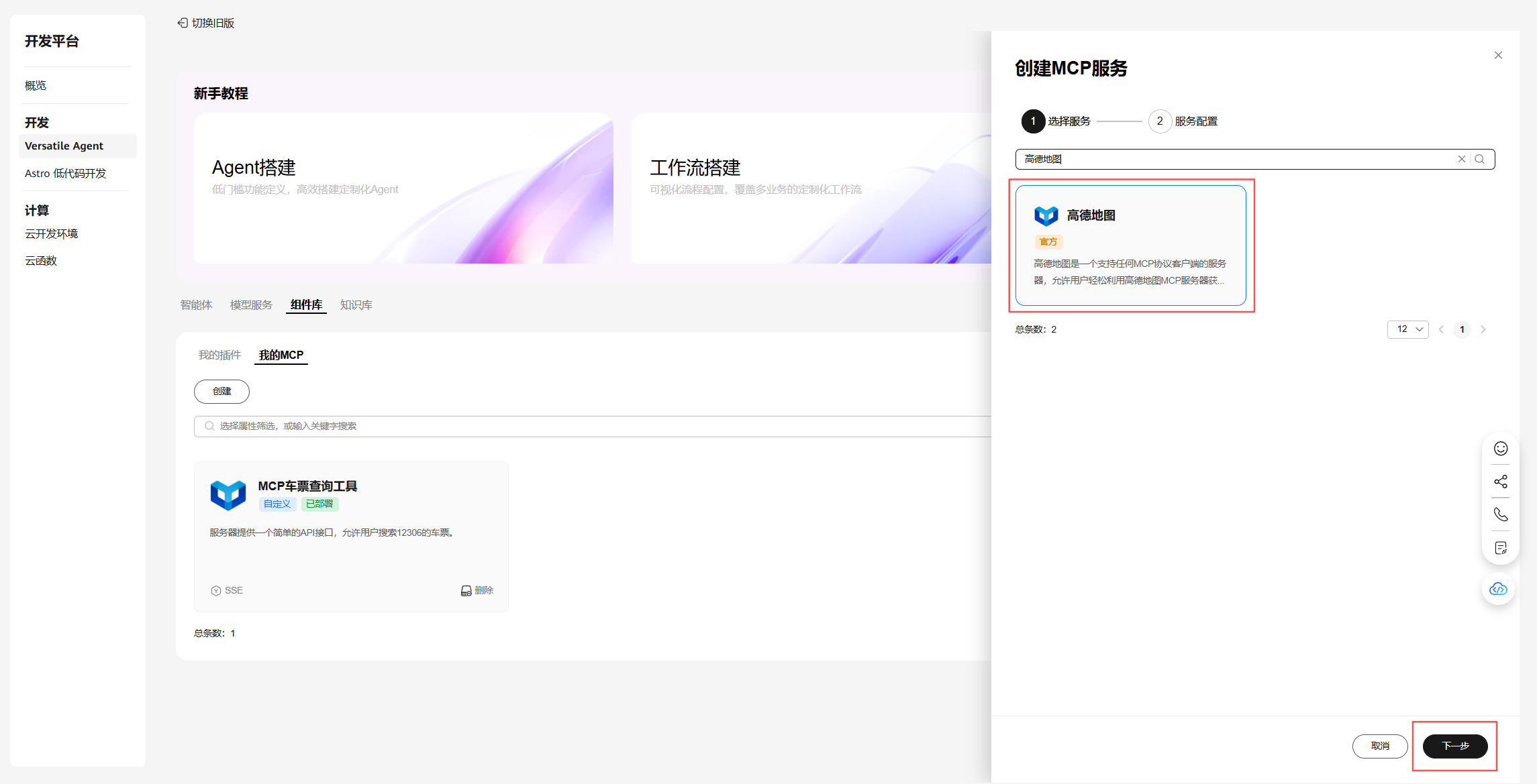 在Versatile Agent平台页签选择组件库 > 我的MCP,点创建。在右侧弹出的创建MCP服务“抽屉”,步骤“1.选择服务”中,找到高德地图,选中后点下一步。