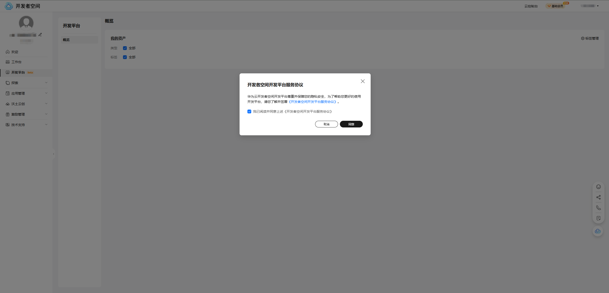 首次登录华为开发者空间 - 开发平台 ,需要签署开发者空间开发平台服务协议。勾选“我已阅读并同意上述《开发者空间开发平台服务协议》”,然后点同意。