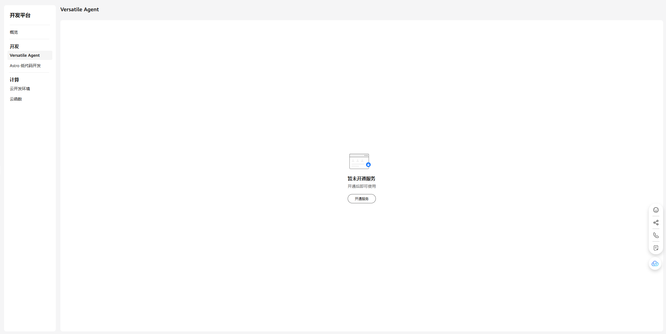 签署协议后,开发平台左侧点Versatile Agent,进入华为开发者空间 - Versatile Agent平台 。点开通服务,根据系统要求完成开通。