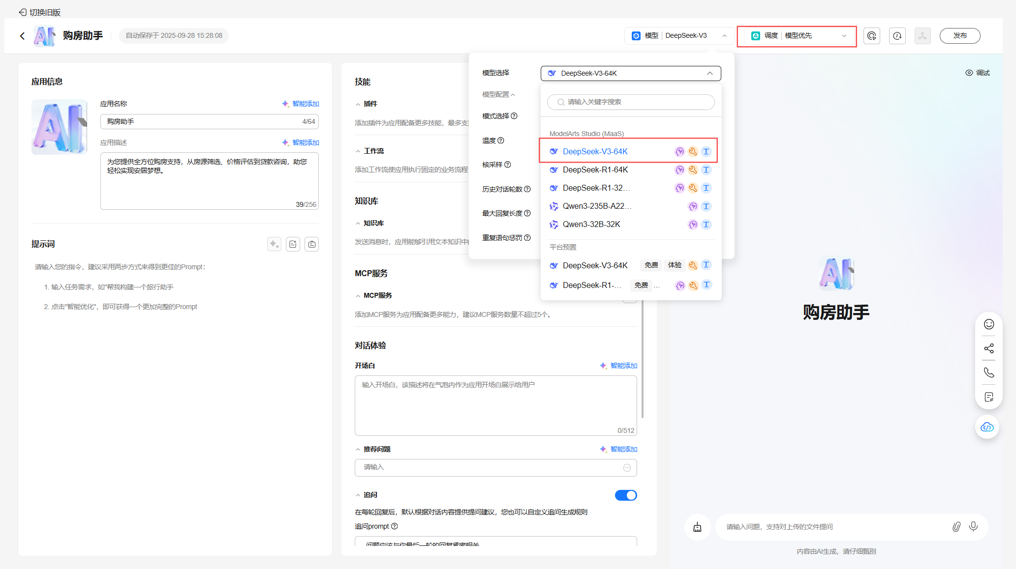 模型选择可以选择平台预置的DeepSeek,也可以选择前面“二、资源准备与基础环境配置”章中的“2. 配置模型”节配置的MaaS模型资源。为了保证应用的运行不受资源限制影响,这里选择ModelArts Studio(MaaS)模型服务中的DeepSeek-V3-64K。