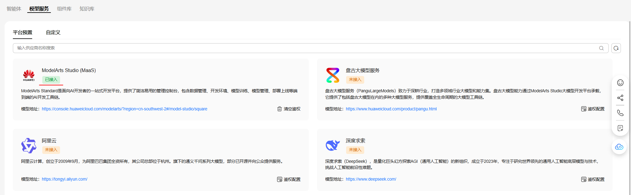 3. 使用Versatile Agent开发平台的服务模型-平台预置功能配置MaaS;