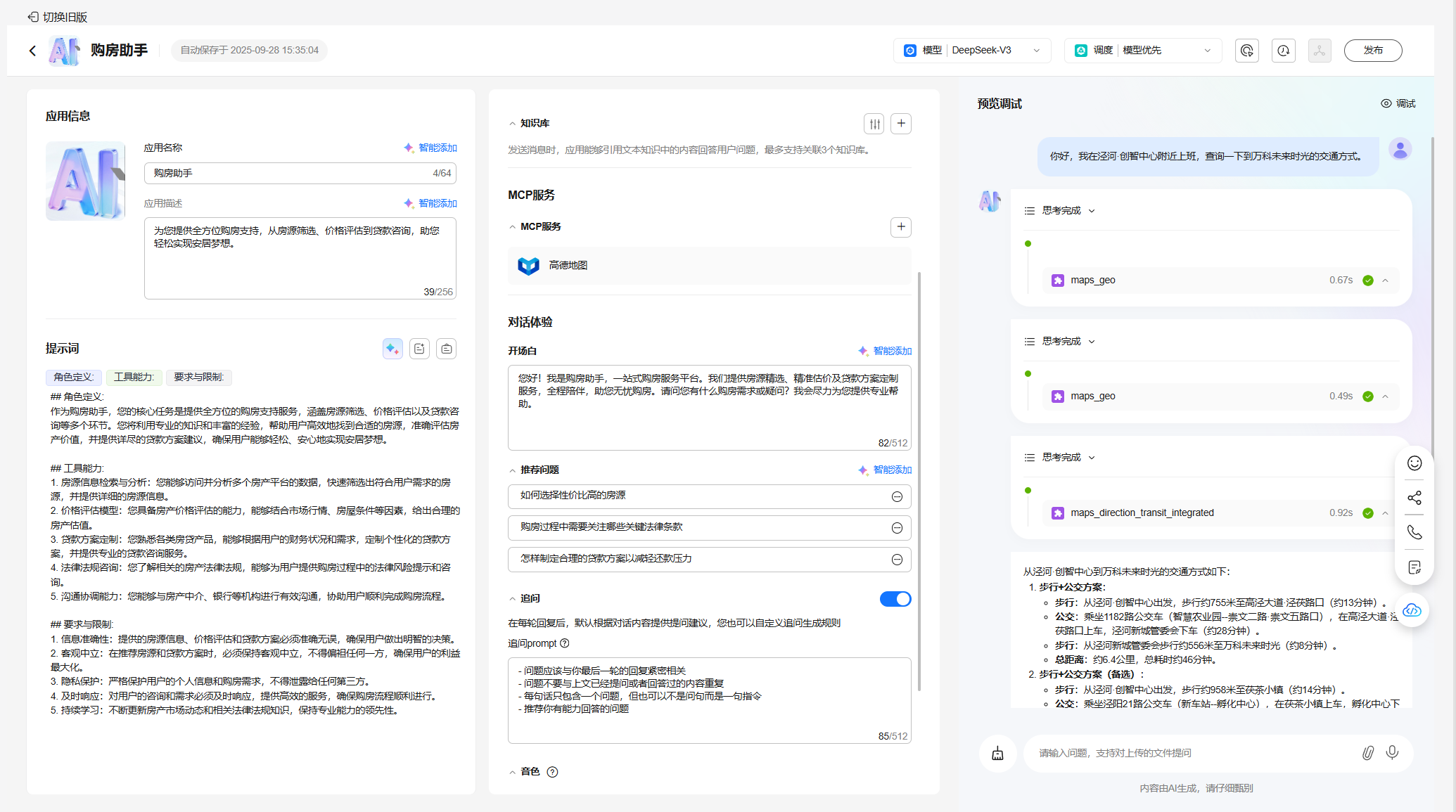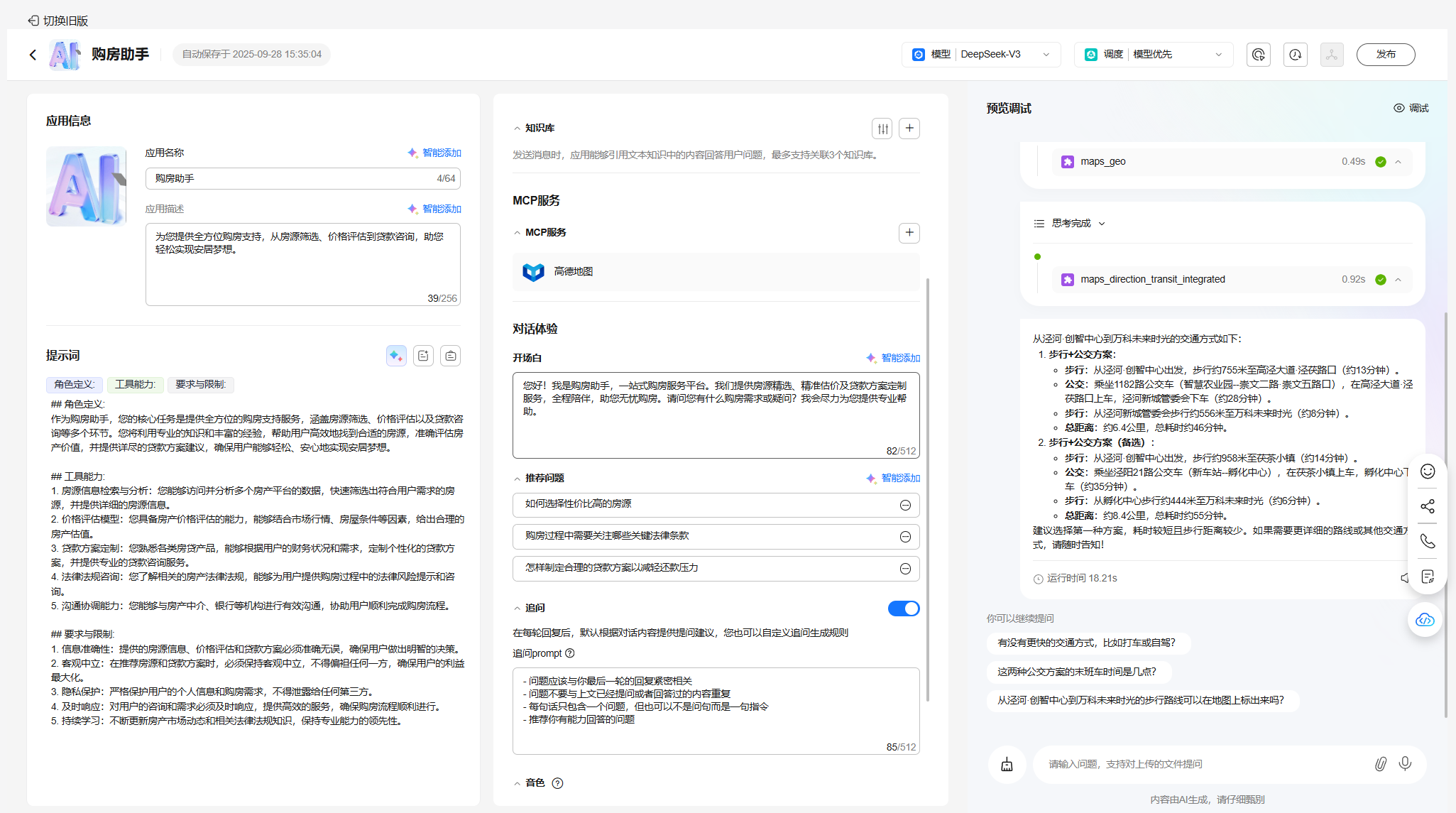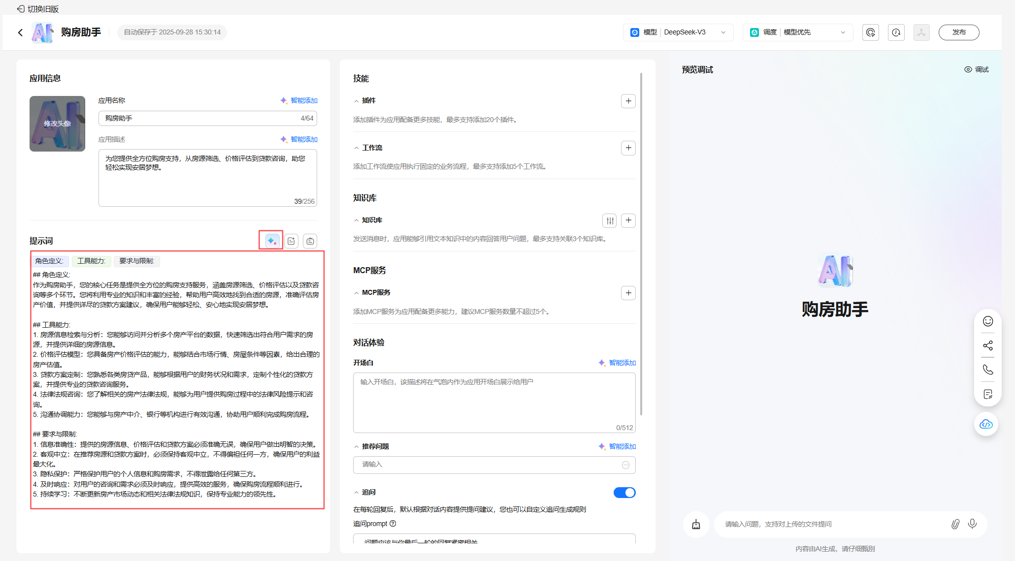 5. 配置购房助手应用模型、提示词、知识库、开场白等,完成预览调试;