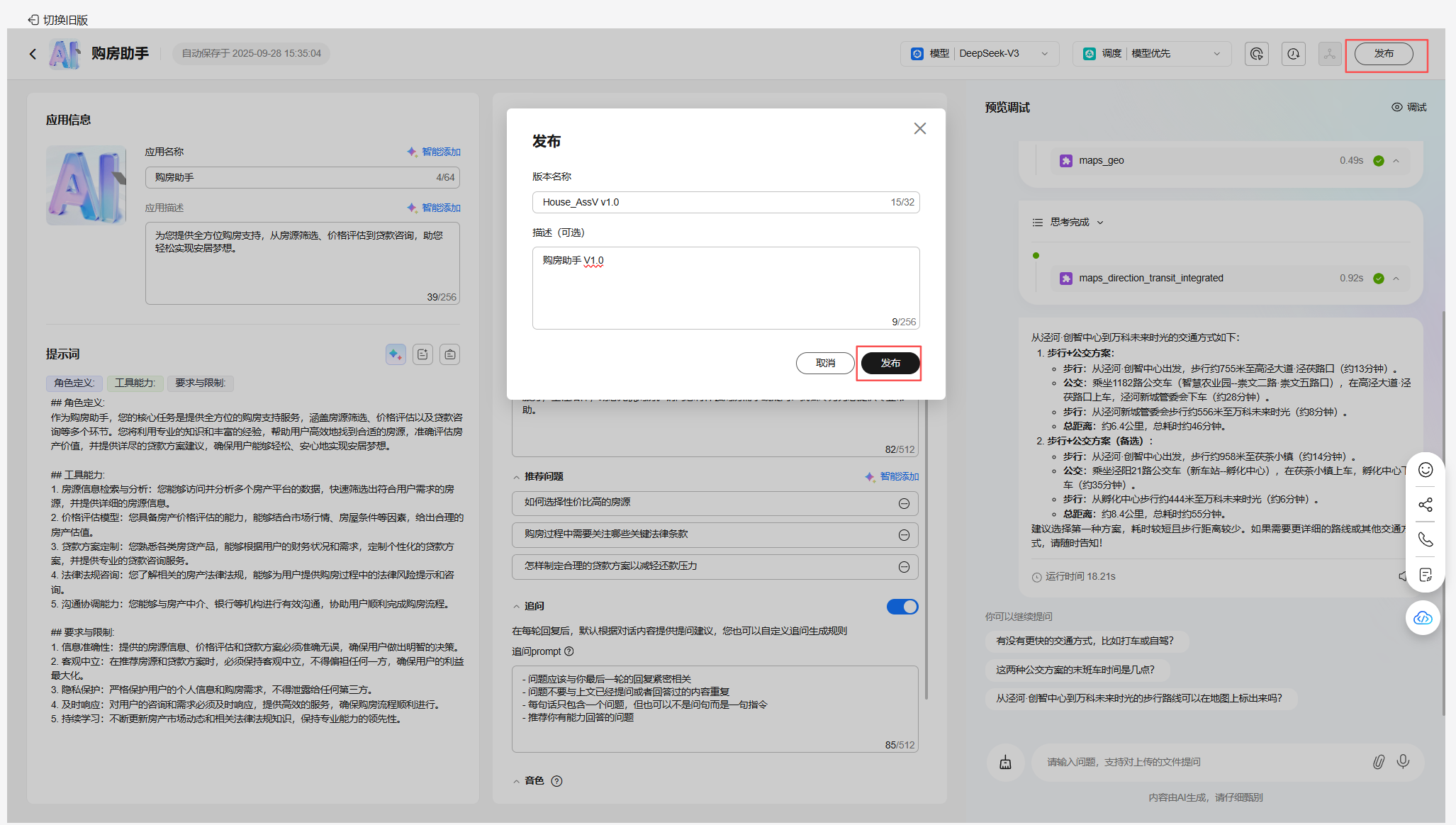 点右上角的发布(首次发布后,按钮变更为更新发布),在发布弹窗中输入版本名称:House_AssV v1.0,描述:购房助手 V1.0,然后点发布。