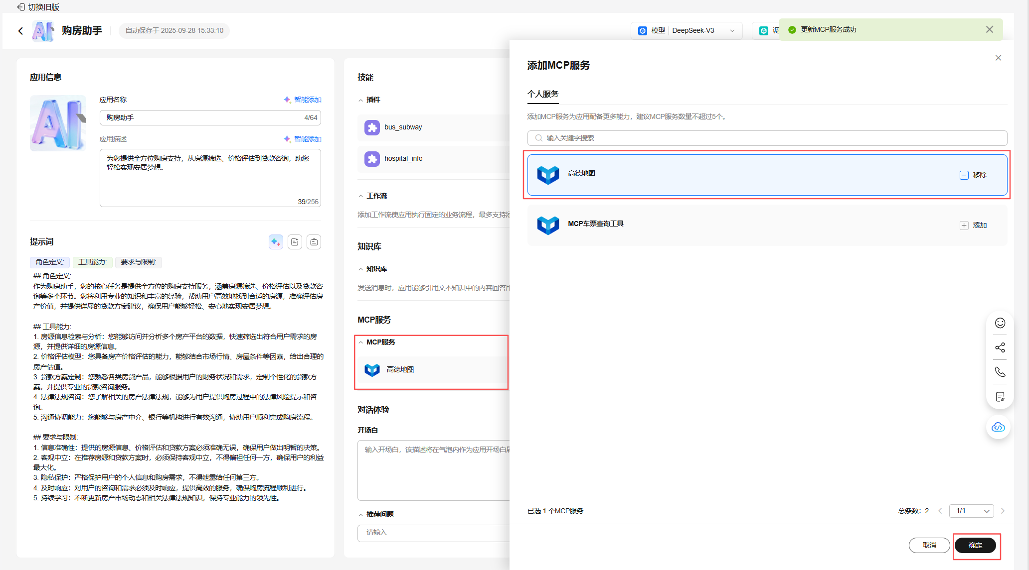 在MCP服务配置板块点其右侧的“+”,在右侧弹出的“抽屉”中找到在“二、资源准备与基础环境配置”章中“3. 配置MCP服务”节创建的MCP车票查询工具,点右侧的添加,然后右下角的确定。