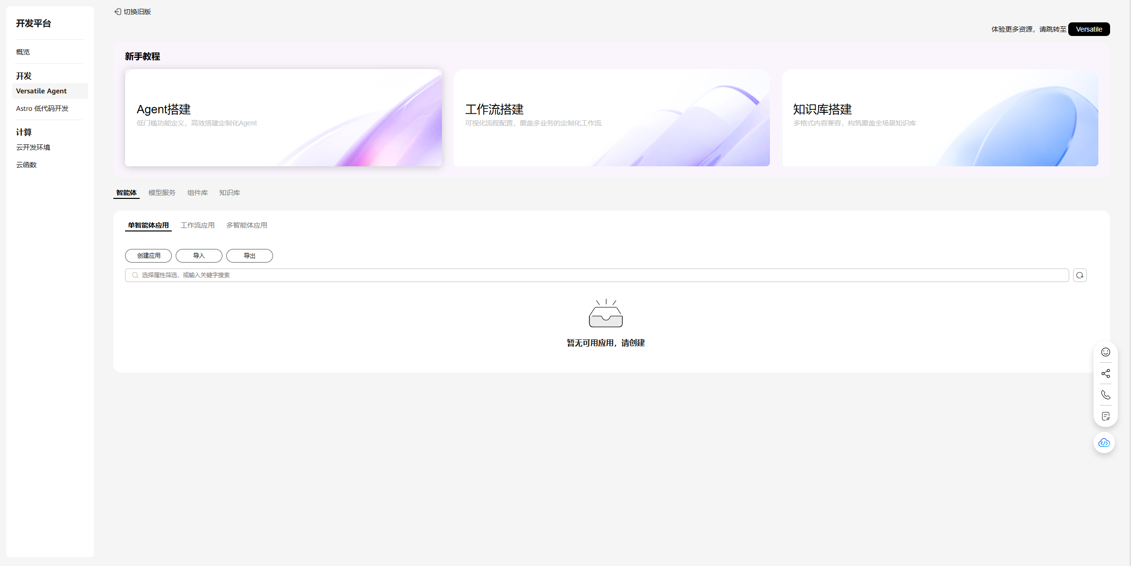 华为开发者空间 - Versatile Agent平台 提供了Agent、大模型、MCP、Versatile空间等能力。