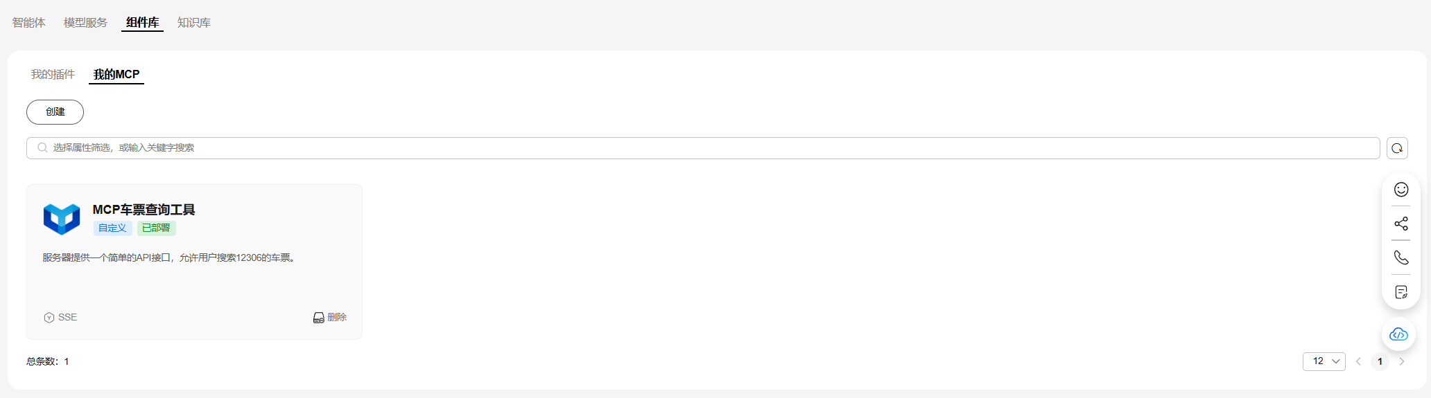 在Versatile Agent平台页签选择组件库 > 我的MCP,点创建。在右侧弹出的创建MCP服务“抽屉”,步骤“1.选择服务”中,找到车票查询工具MCP,选中后点下一步。