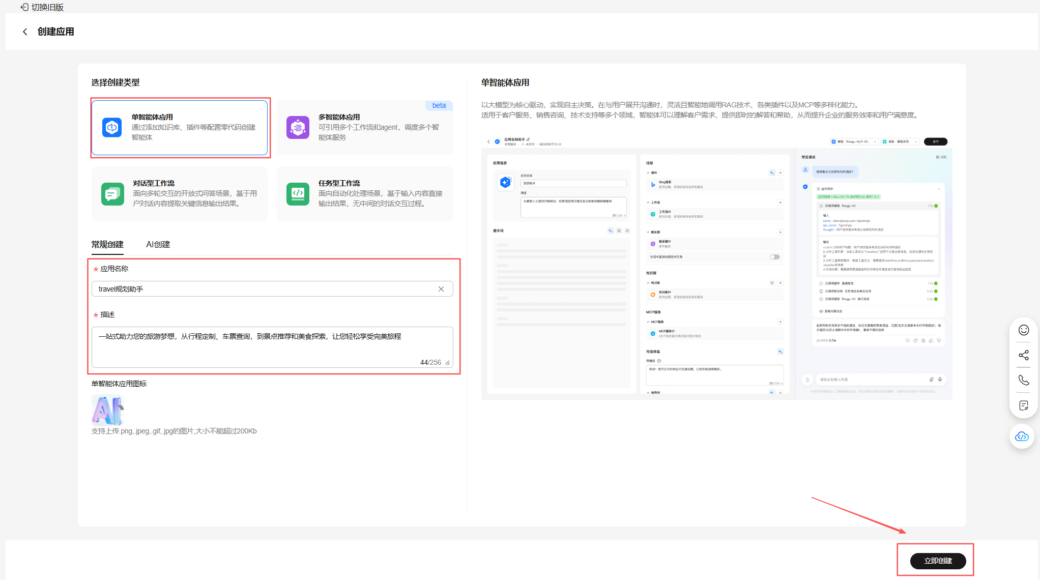 在应用配置界面,创建类型选择默认的单智能体应用,页签选择常规创建,然后配置应用名称及其描述。