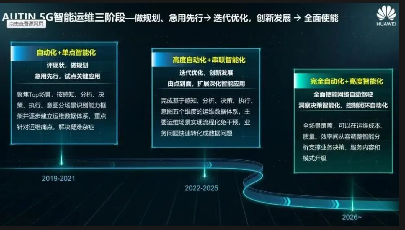 在华为的 5G 网络运维解决方案中,为对 5G 带来的运维新挑战,高效且高质量地管理四代共生网络,基于人工智能,华为推出了智能运维解决方案 AUTIN,它不仅仅是通过自动化减少人为失误和提升效率,而且通过机器学习对运维大数据进行分析和建模,从而实现故障的预防,减少网络风险。华为的5G领先,事实上就包括对人工智能技术的投入和应用。