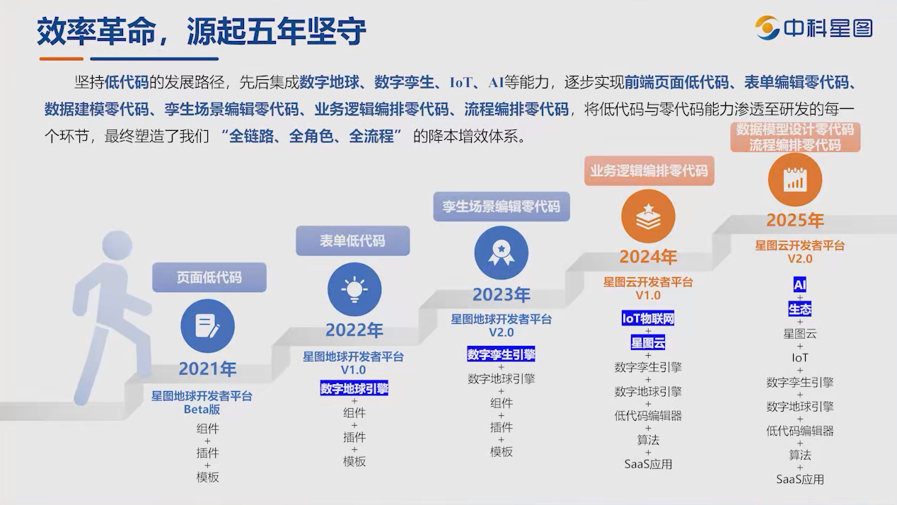 五年时间,星图云开发者平台始终坚守目标,并在项目中不断验证与迭代,从单一工具逐步进化为完整平台,集成数字地球、数字孪生、AI能力,实现前端页面低代码、表单编辑、数据建模、孪生场景构建、业务逻辑编排、工作流编排的零代码化。