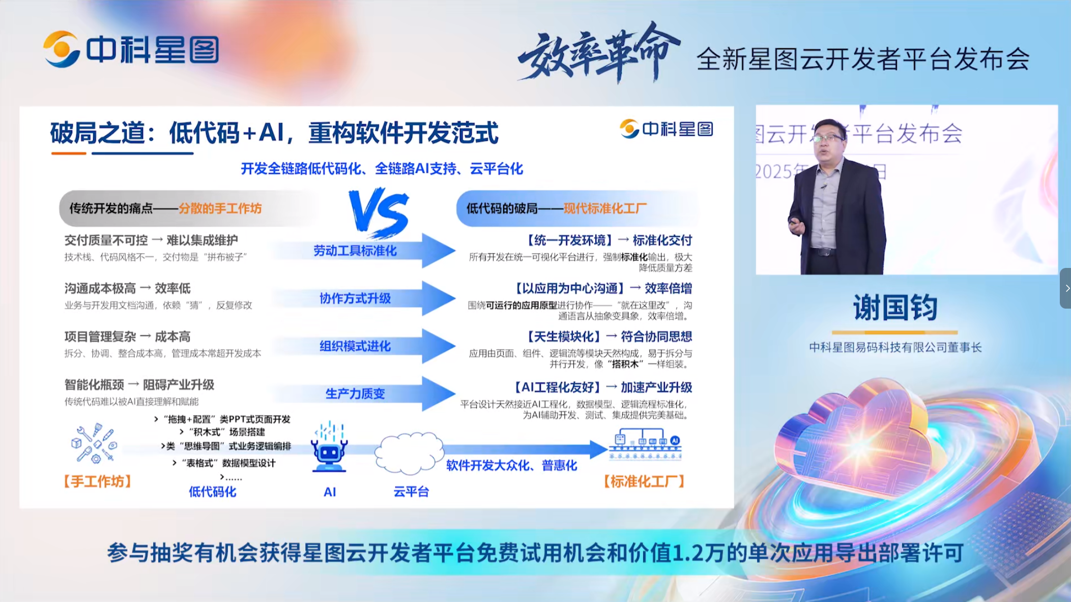 “为了能完成以上的设想其实就可以逐渐完成我们心目中的三个核心的目的。一是更低的成本,第二个是更高的效率,第三就是更广的参与度。总结来说的话就是低代码加AI它带来的不仅仅是一种新的工具,更是一场开发范式的变革。 它将软件开发从依赖个人英雄主义的‘手艺’,变成了可规模化、可度量的‘现代工业’。” ——中科星图易码(无锡)科技有限公司董事长 谢国钧。