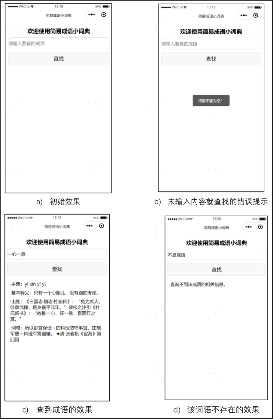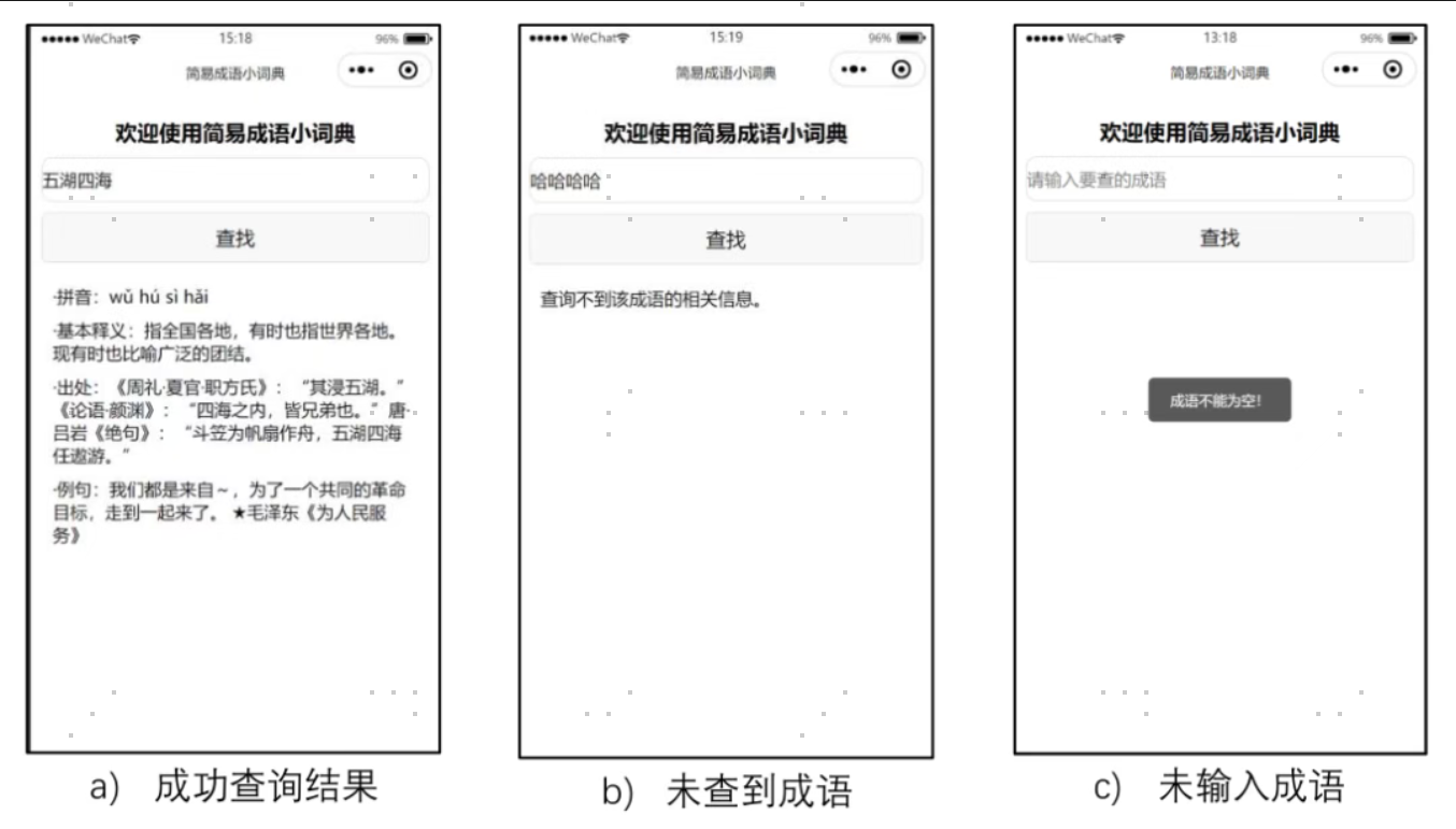 在查询时发现数据库里有些成语的出处或例句不全,不妨修改一下页面显示的内容,隐藏没有查到的字段。index.wxml代码修改如下: