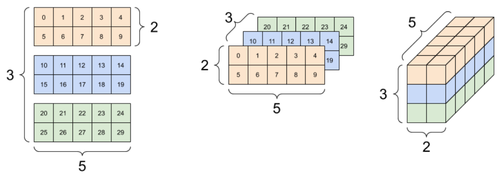 对于包含 2 个以上的轴的张量,您可以通过多种方式加以呈现。3 轴张量,形状:[3, 2, 5]