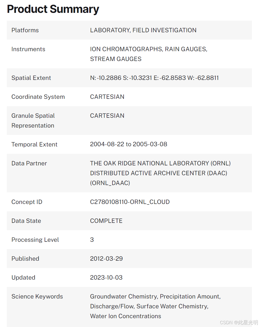 【摘要】 LBA-ECO ND-03 Forest and Pasture Watershed Hydrochemistry, Rondonia, Brazil简介该数据集包含来自溪流、水井、雨水和林冠穿透雨的水化学数据。现场测量在巴西朗多尼亚州兰乔格兰德(Rancho Grande)进行,该地位于巴西西南部的亚马逊盆地,测量区域包括两个相邻的流域:一片森林(1.37 公顷)和一片牧场(0.73 公...