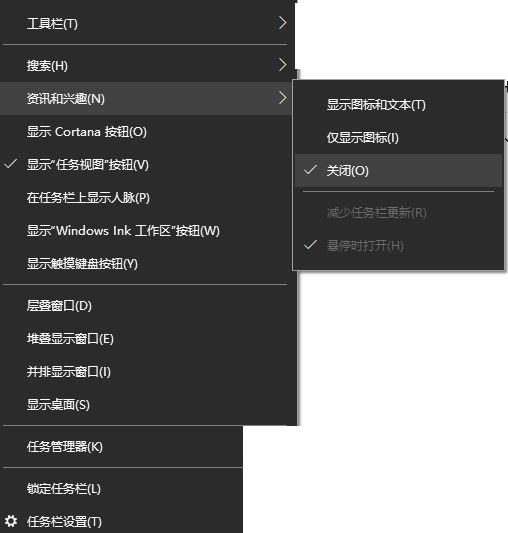 另外,若任务栏有“资讯和兴趣”模块,右键点击它,选择“关闭”,也能解决该功能卡死导致的问题。
