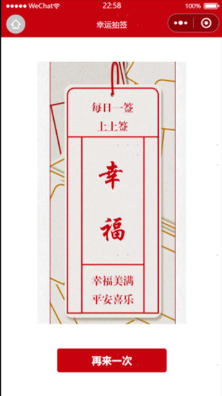 结果页也是一个垂直排列、水平方向居中的布局,主要包含上方是抽签结果的幸运签图片、下方是“再来一次”按钮。页面设计图如10-19所示。