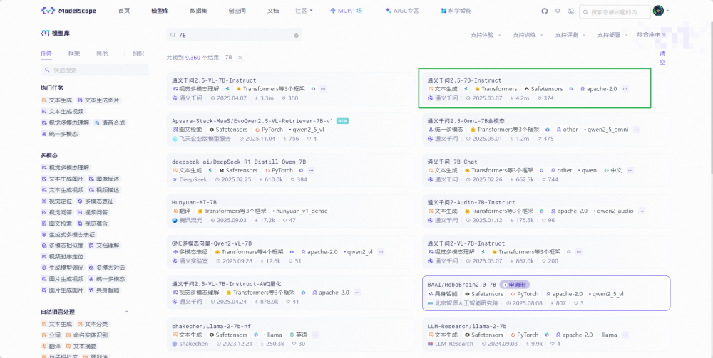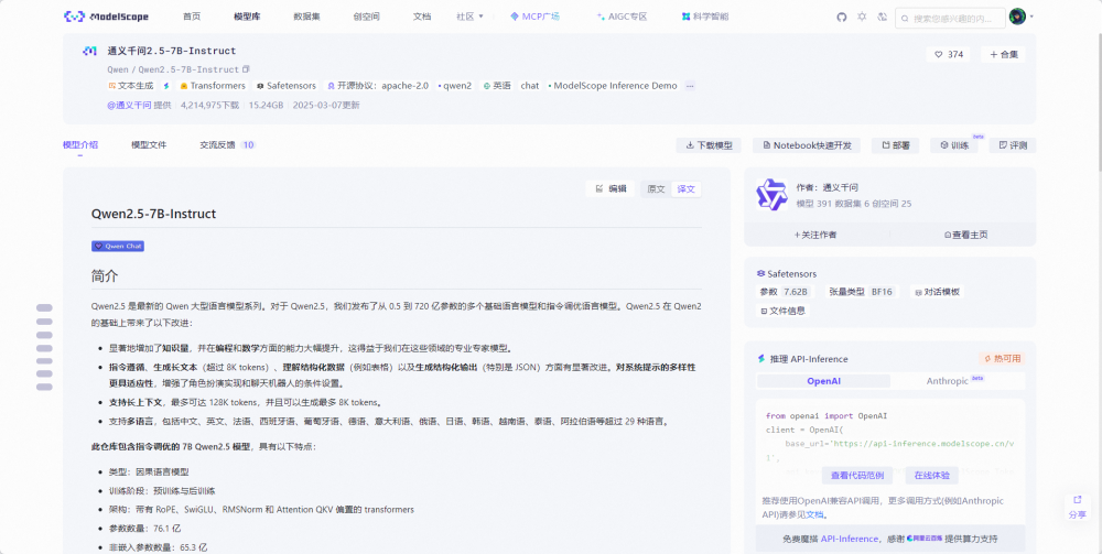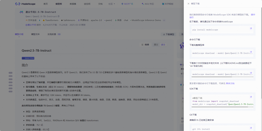 在魔搭社区模型库中找到通义千问2.5-7B-Instruct并进入详情