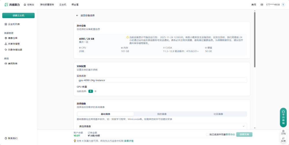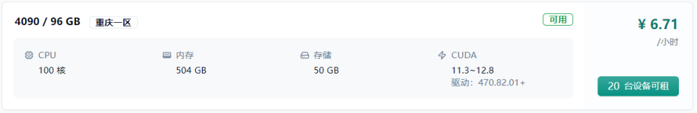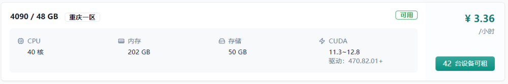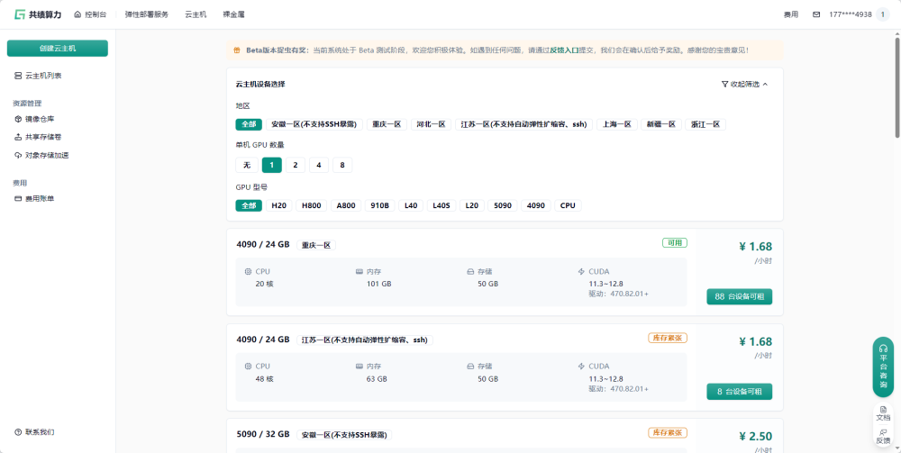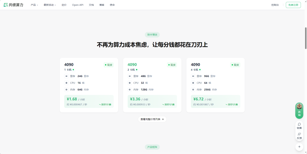 共绩算力平台的核心优势之一在于其极具竞争力的价格体系,真正实现了“降本增效”,让每一分钱都花在刀刃上。与传统云服务商动辄数十元甚至上百元每小时的GPU算力相比,共绩平台提供的4090显卡算力价格低至1.68元/小时(单卡),双卡配置仅需3.36元/小时,四卡集群也仅为6.72元/小时。这种按秒计费的精细化模式,意味着用户只需为实际使用的每一秒付费,避免了传统按小时计费带来的资源浪费和成本冗余。