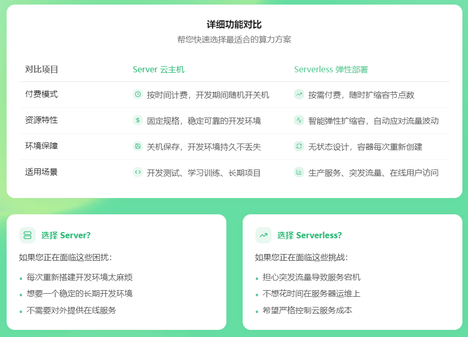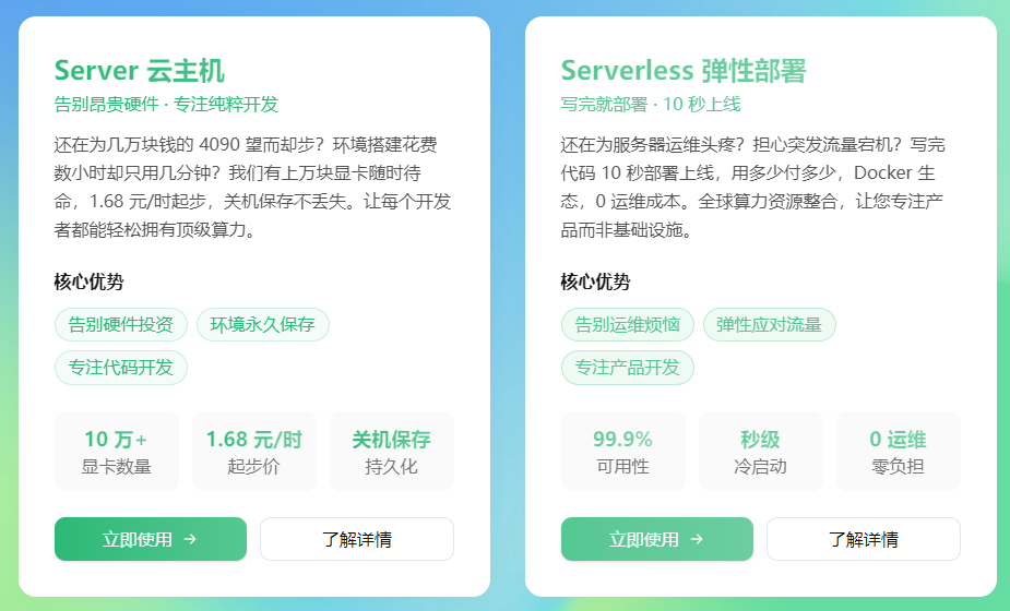 无论是追求环境稳定、适合长期开发的 Server 云主机,还是追求极致效率、零运维负担的 Serverless 弹性部署,共绩算力平台都提供了针对性强、性价比极高的解决方案,帮助开发者和企业摆脱基础设施束缚,专注于价值创造。