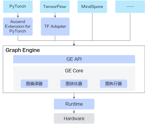 GE 图引擎最显著的特点之一是其强大的多框架适配能力。通过统一的图开发接口,GE 支持对接上层基于图的开放框架,目前已适配 PyTorch(TorchAir 图模式)、TensorFlow、MindSpore、PaddlePaddle 等主流 AI 框架。 这种多框架支持不是简单的接口转换,而是深度理解各框架的计算图特性,实现高效的映射和优化。