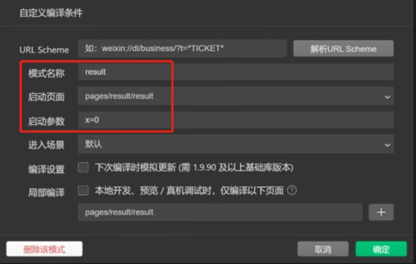 由于摇一摇功能需要用真机预览或调试,开发者如果不方便来回切换可以顶部“普通编译”处新增结果页的编译模式。参数配置可参考图10-21。