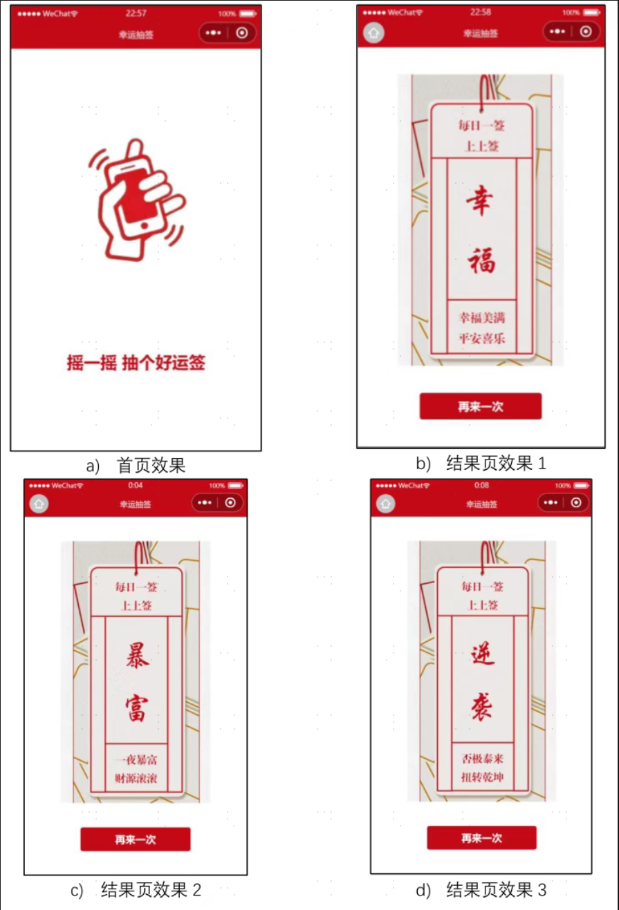 本案例主要为了演示通过对加速度传感器监听确认用户进行了摇一摇功能,顺便复习了如何触发手机振动的功能。该案例全部都是上上签,表达了作者对读者朋友们的祝愿。开发者如有兴趣还可继续添加更多类型的签进去。
