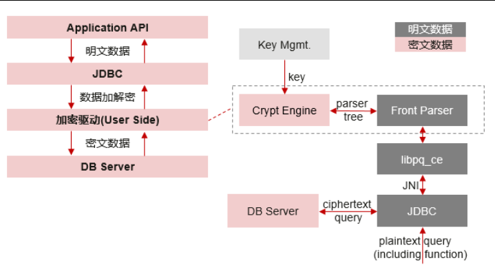 - 查询条件转换:用户输入的明文查询条件在客户端自动加密,以密文形式传递给数据库